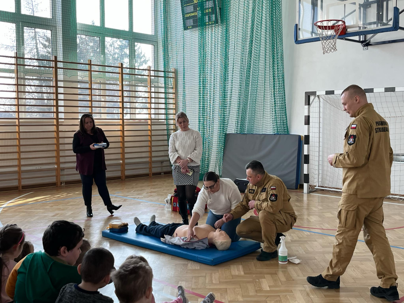 Przedstawiciele straży pożarnej demonstrują udzielanie pierwszej pomocy.