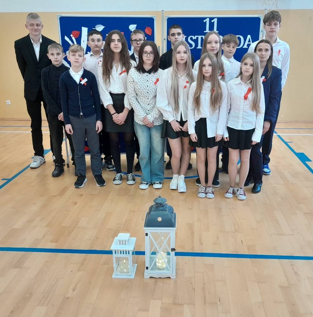 Dziś w naszej szkole odbyła się akademia, podczas której uczniowie z klasy IV, V i VII wprowadzili widzów w tą podniosłą atmosferę. Pieśni, piosenki, wiersze zaprezentowane przez uczniów podkreślały nastrój walki o niepodległość. Wszyscy uczniowie, nawet Ci najmłodsi z zerówki wykazali dziś szacunek dla historii, patriotyzmu poprzez strój i kotyliony w narodowych barwach.
