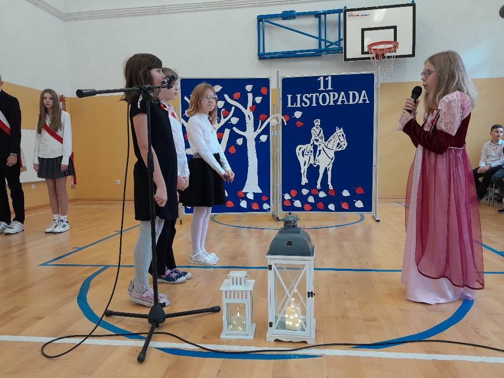 Uczniowie klasy czwartej i piątej przy mikrofonach, z małymi flagami Polski w dłoniach