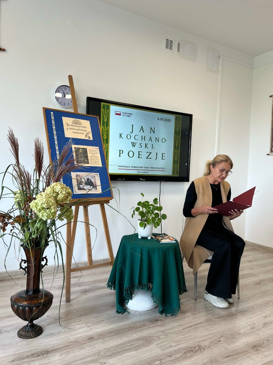 Nauczycielka języka polskiego czyta poezję, siedząc na tle dekoracji okolicznościowej