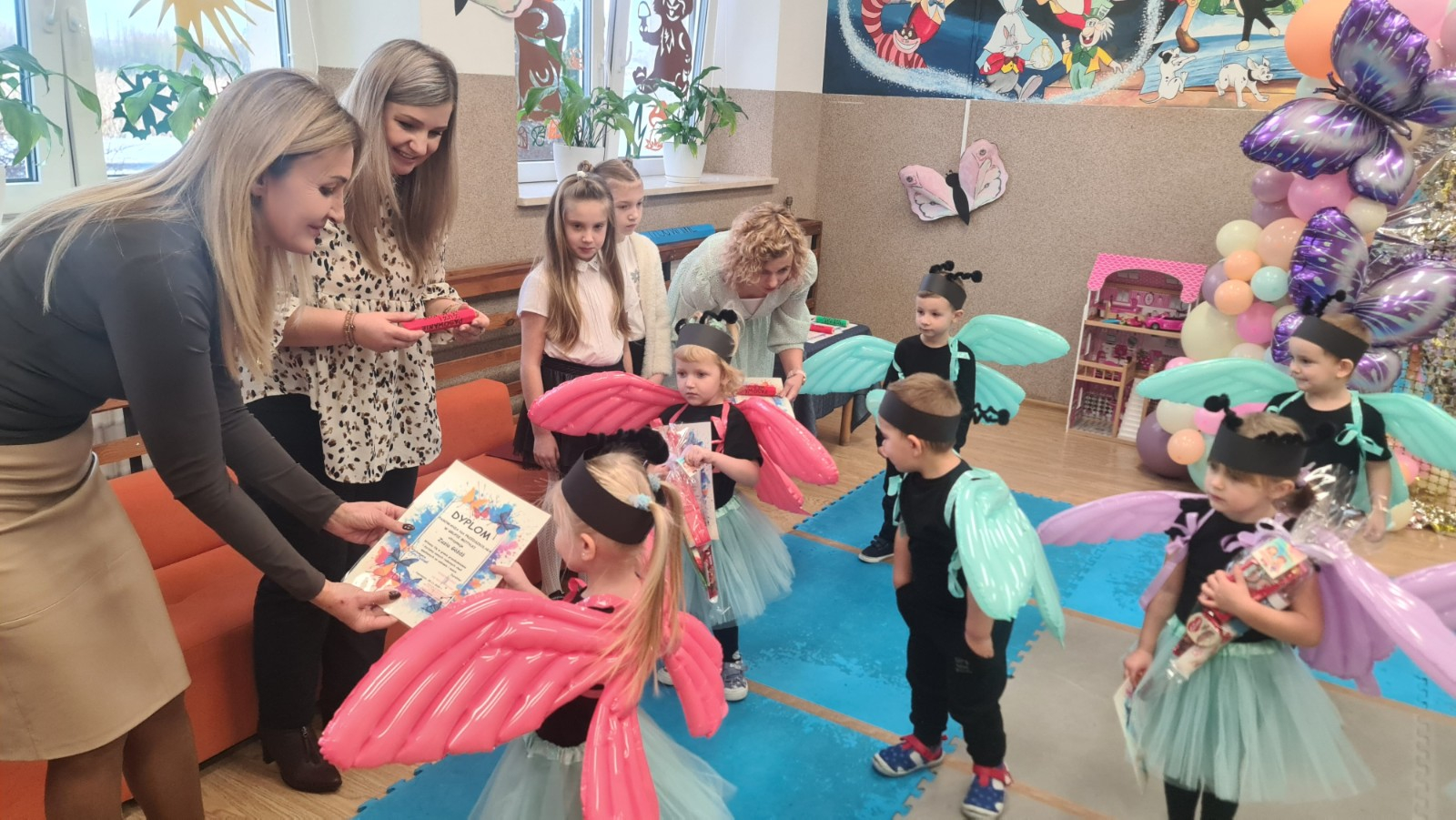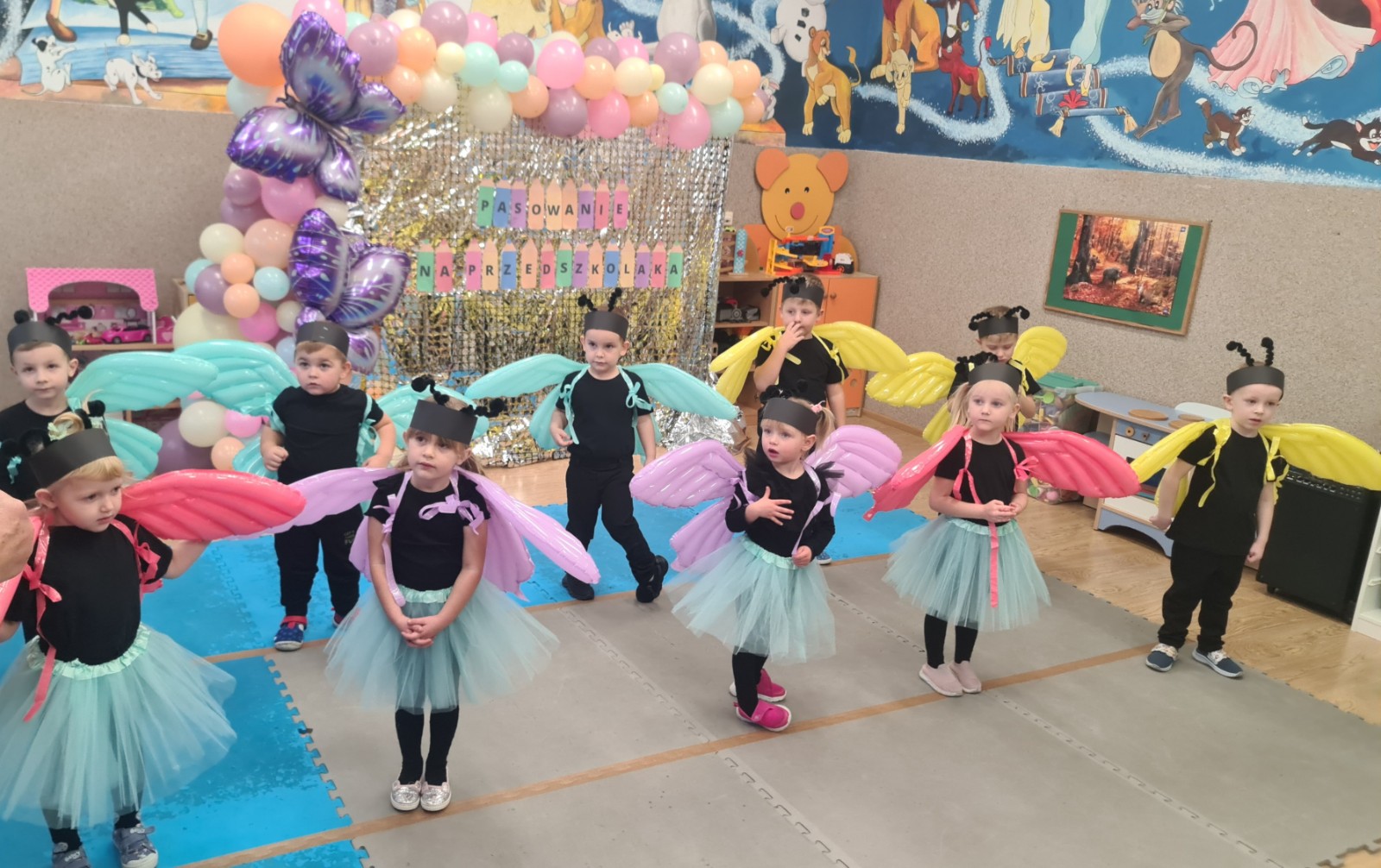 Przedszkolaki w strojach motyli tańczą przy muzyce