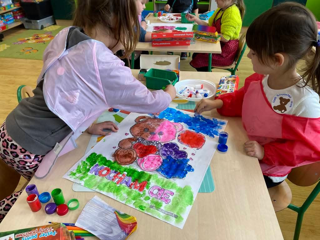 Dzieci brały udział w różnorodnych aktywnościach edukacyjnych i zabawowych. Wykonywały prace plastyczne związane z tematyką misiów, rozwijając przy tym kreatywność oraz sprawność manualną. Nie zabrakło także zabaw ruchowych, ćwiczeń muzycznych i zajęć dydaktycznych, podczas których dzieci liczyły, dopasowywały elementy, rozwiązywały proste zadania oraz uczestniczyły w zabawach językowych.