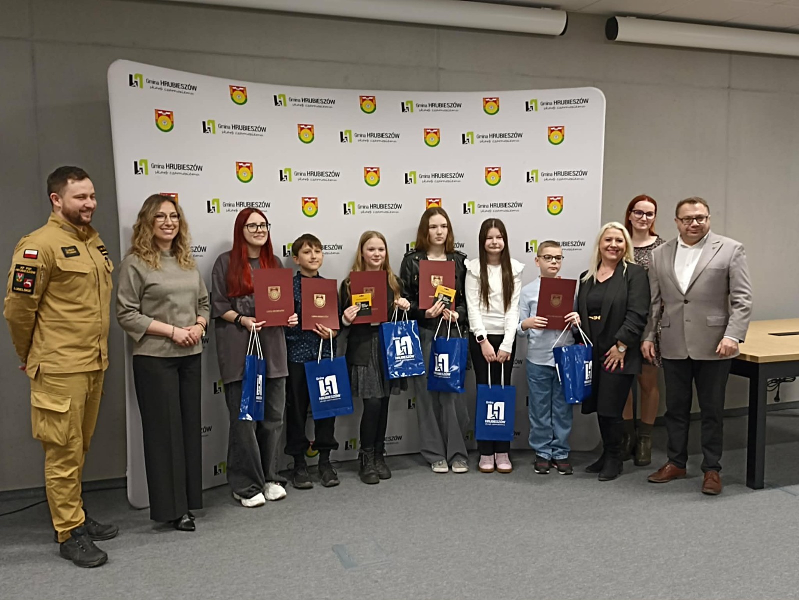 Uczestnicy gminnych eliminacji turnieju wiedzy pożarniczej stoją w grupie z dyplomami i nagrodami. Towarzyszą im organizatorzy oraz przedstawiciel straży pożarnej.