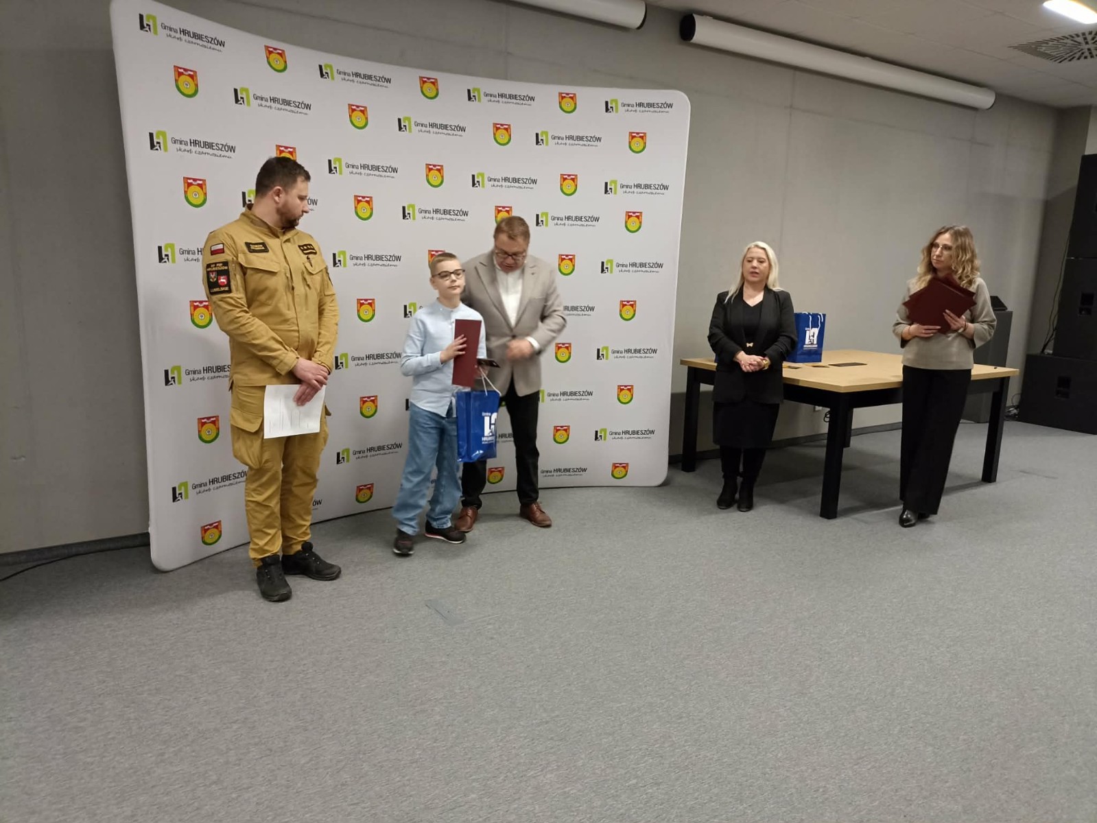 Moment wręczenia nagrody Aronowi Puchale przez przedstawiciela władz gminy. Obok stoi strażak oraz organizatorzy konkursu.
