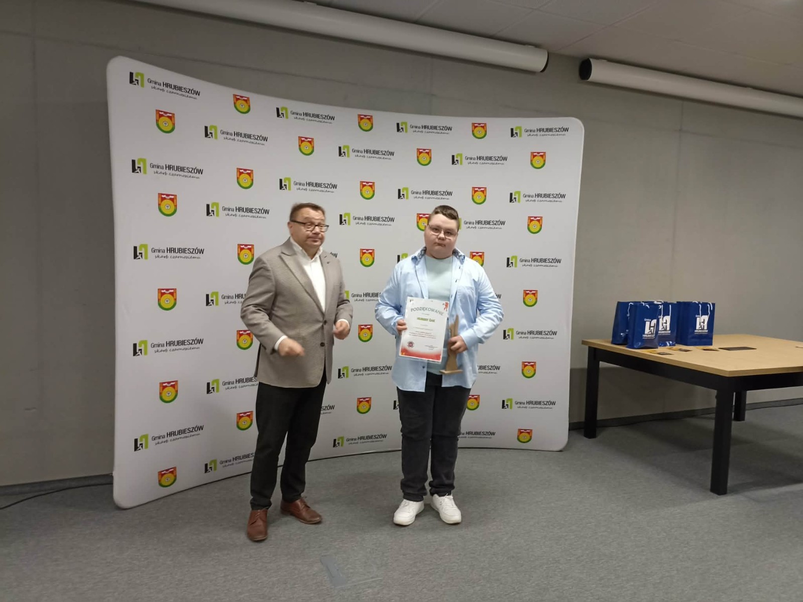 Uczeń prezentuje dyplom i nagrodę po zakończeniu konkursu, stojąc obok przedstawiciela władz gminy.