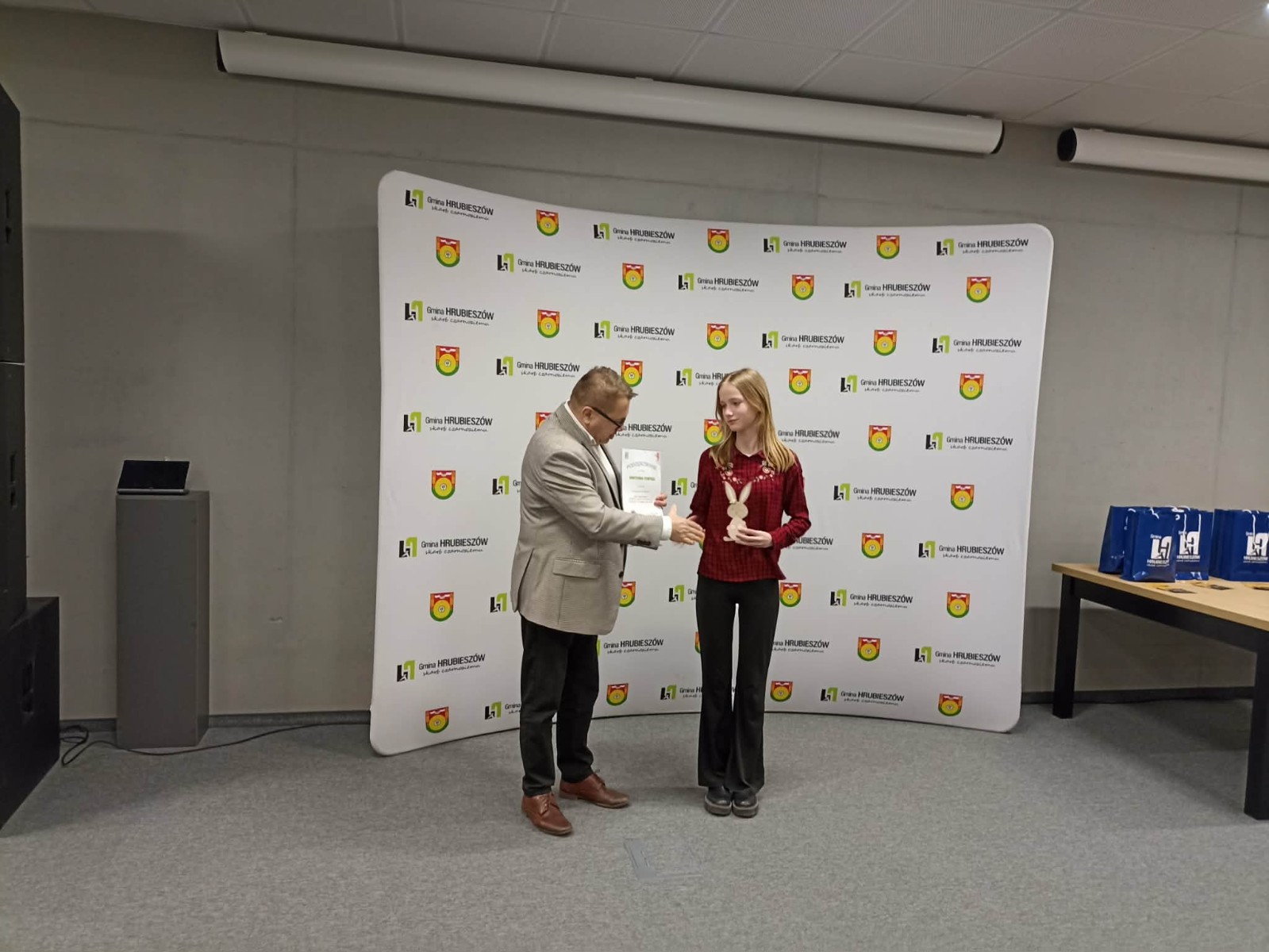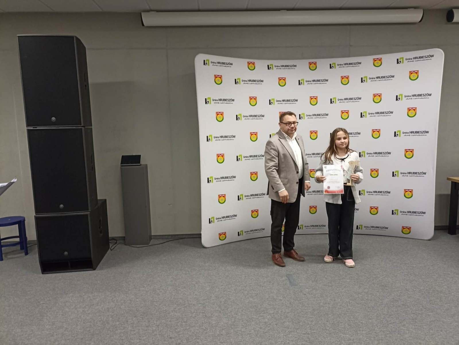 Uczennica prezentuje dyplom i nagrodę po zakończeniu konkursu, stojąc obok przedstawiciela władz gminy.