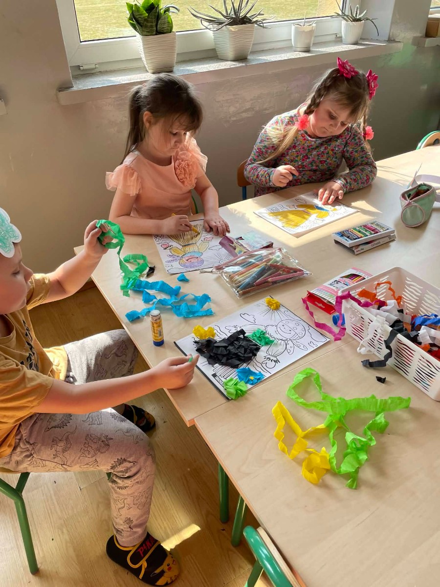 Dzieci przy stoliku wykonują prace plastyczne z wykorzystaniem kolorowej bibuły i materiałów plastycznych.