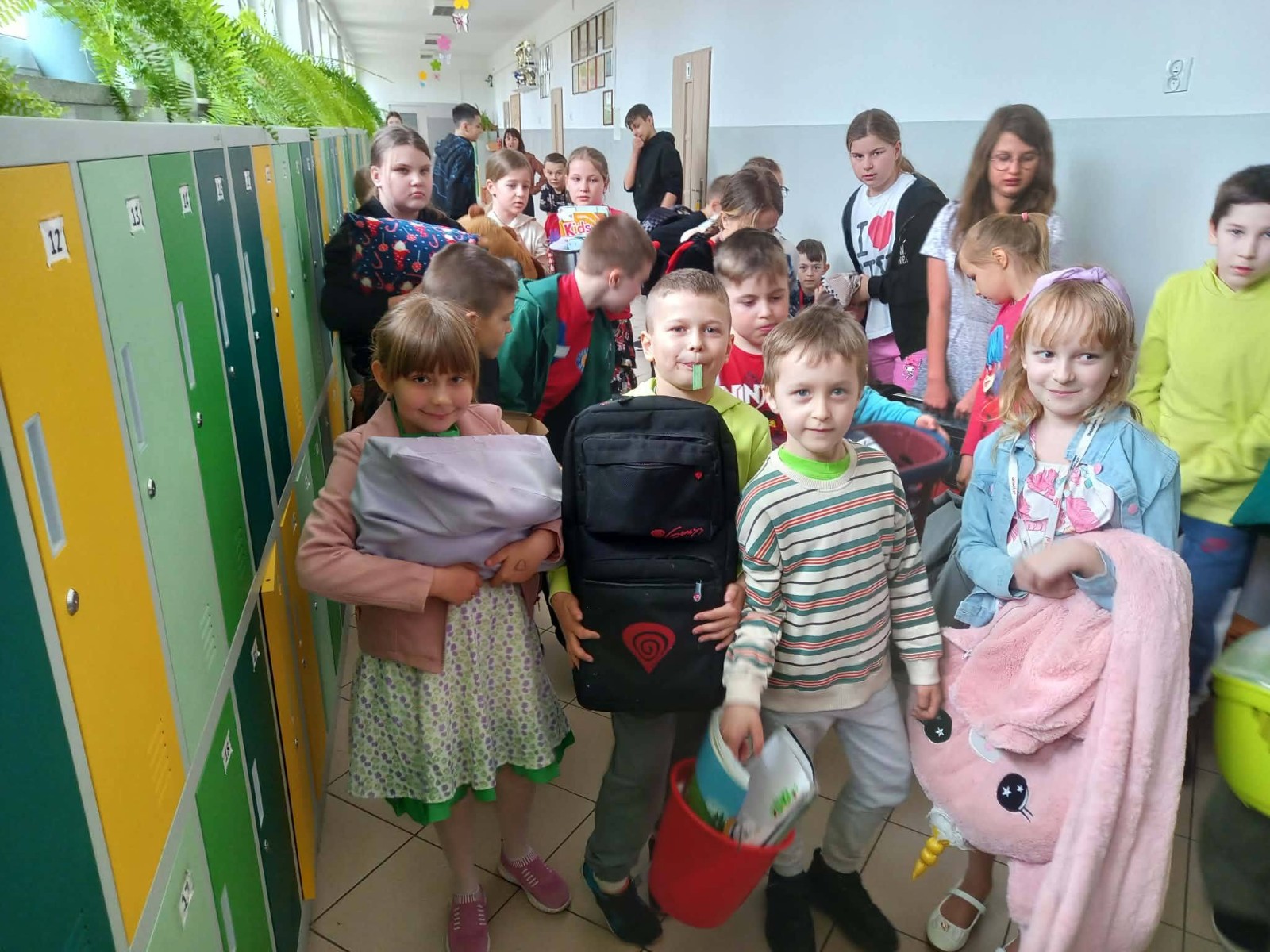 Uczniowie na korytarzu prezentują swoje rzeczy przyniesione zamiast plecaków, trzymając m.in. poduszki, wiadra i torby.