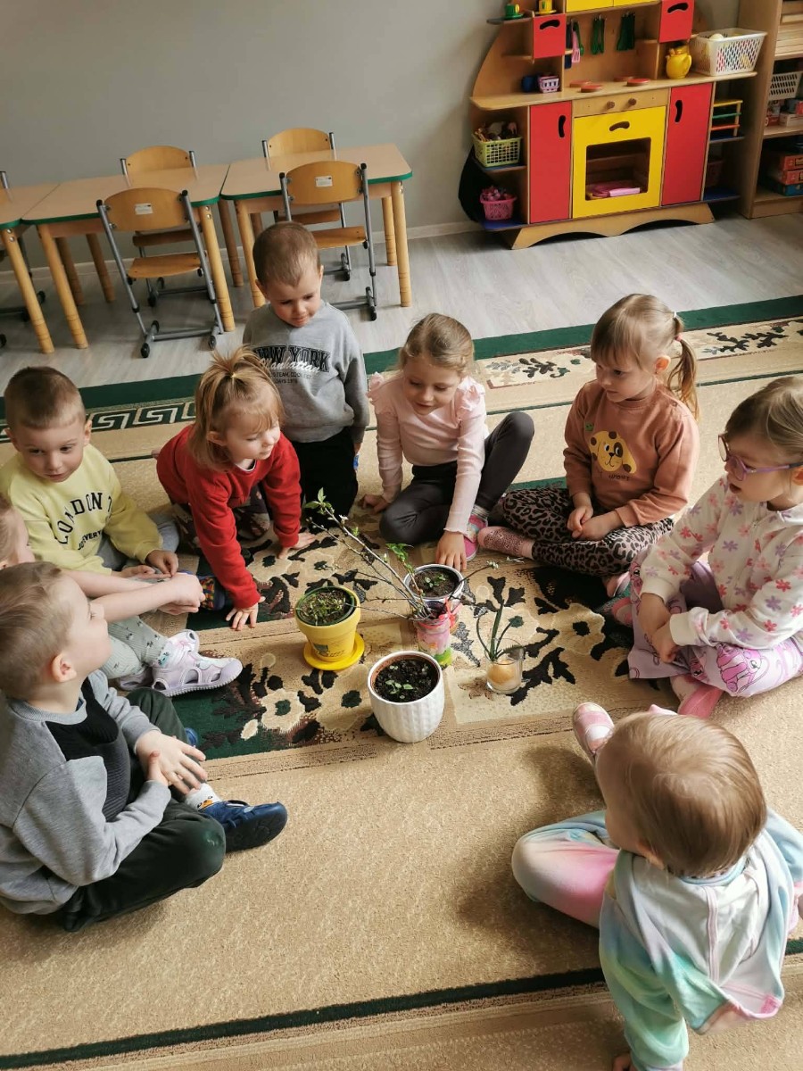 Dzieci siedzą na dywanie wokół roślin i obserwują je podczas zajęć przyrodniczych.