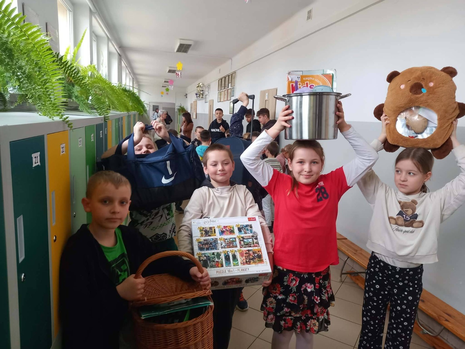 Uczniowie na szkolnym korytarzu prezentują nietypowe „plecaki” w ramach Dnia bez plecaka – wśród nich znajdują się m.in. garnek, koszyk i torby.