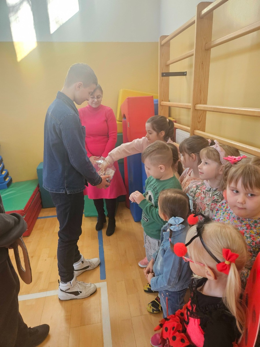 Na rozpoczęcie dnia Samorząd Uczniowski przygotował dla wszystkich uczniów słodką niespodziankę – każdy otrzymał lizaka, co wprowadziło wszystkich w pogodny, wiosenny nastrój.