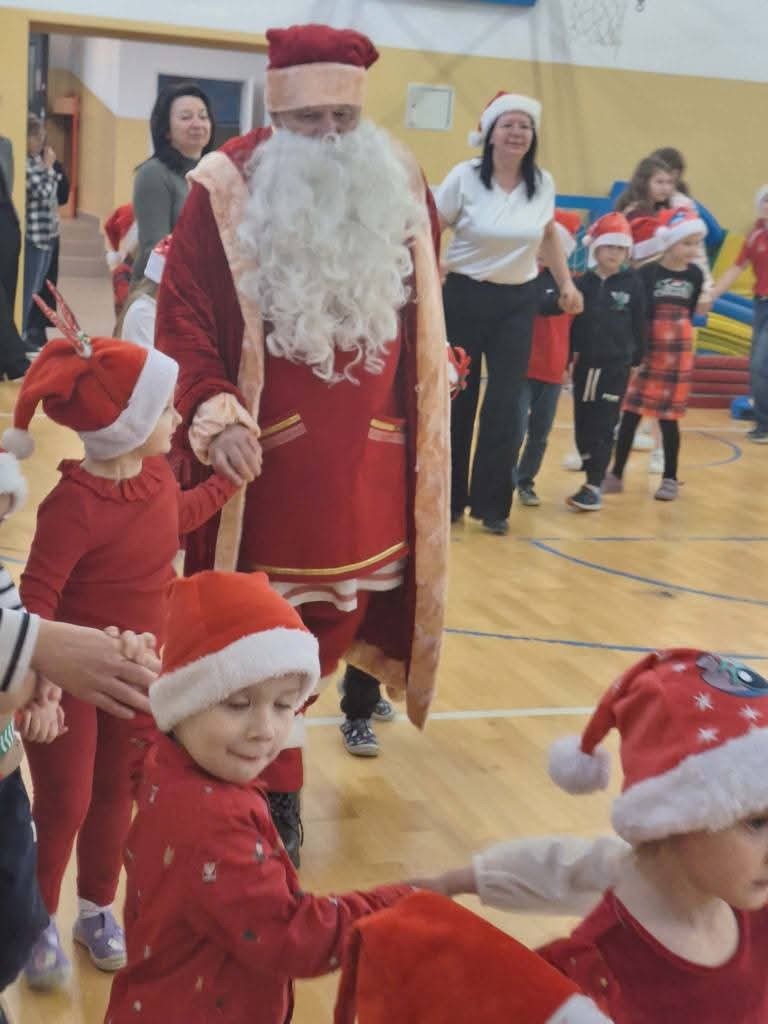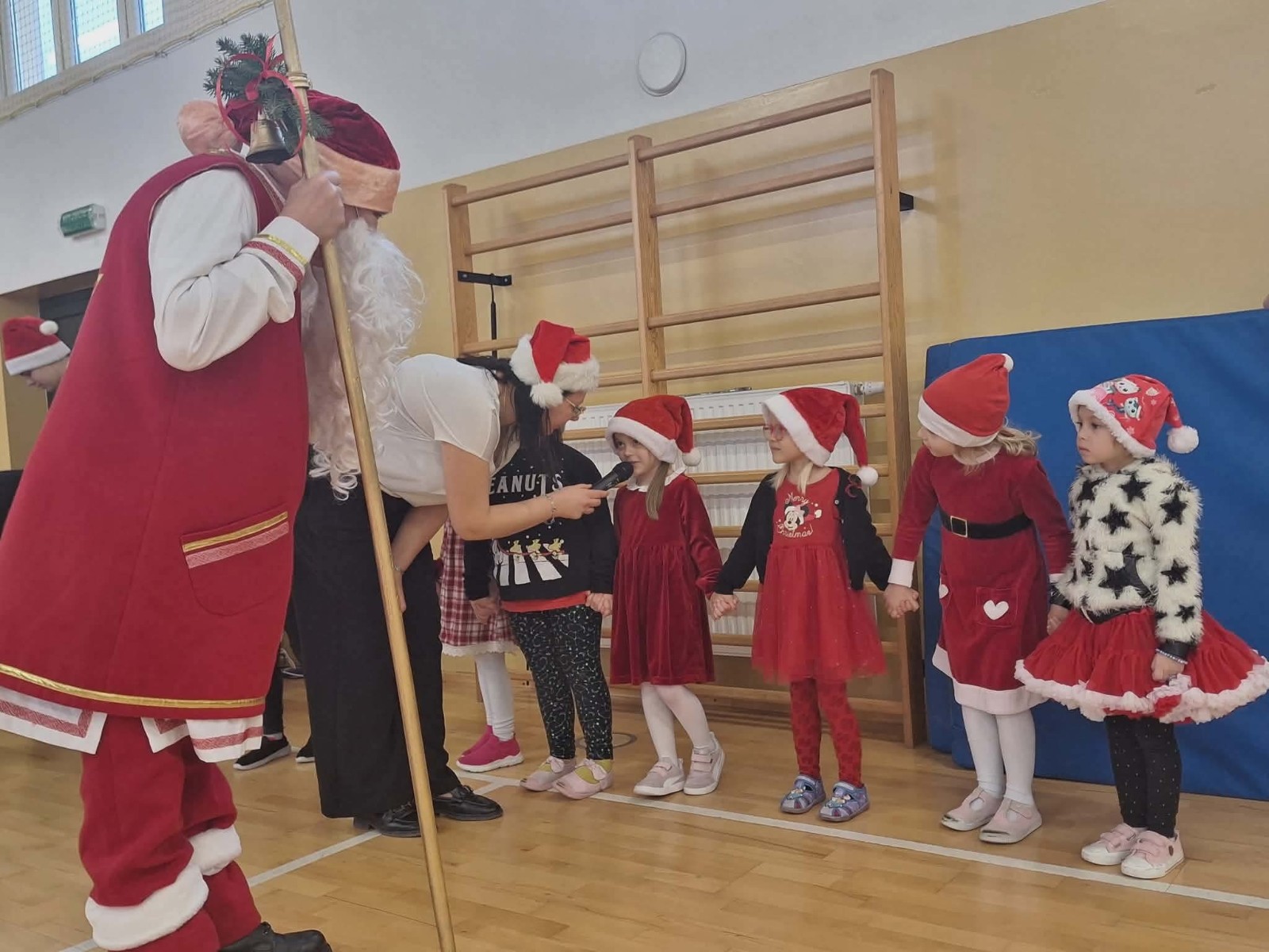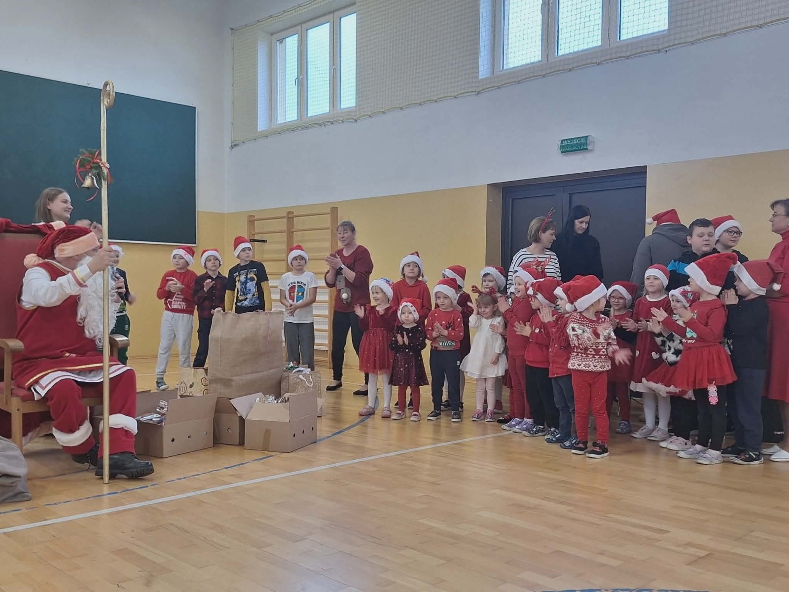 Spotkanie rozpoczęło się na sali gimnastycznej, gdzie dzieci zaprezentowały przygotowane piosenki, wierszyki i krótkie występy. Mikołaj z uwagą wysłuchał każdego z uczniów, a następnie obdarował ich upominkami. Wspólne zdjęcia i rozmowy stworzyły ciepłą, życzliwą atmosferę, którą wszyscy zapamiętają na długo.