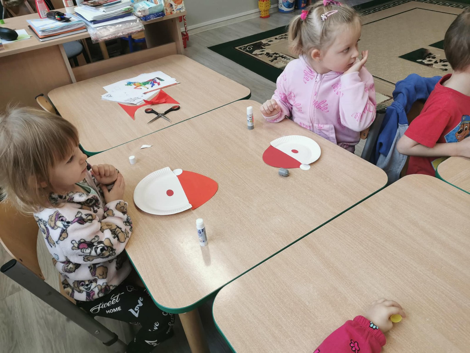 Dzieci przy stoliku przygotowują elementy papierowej czapki do pracy plastycznej.