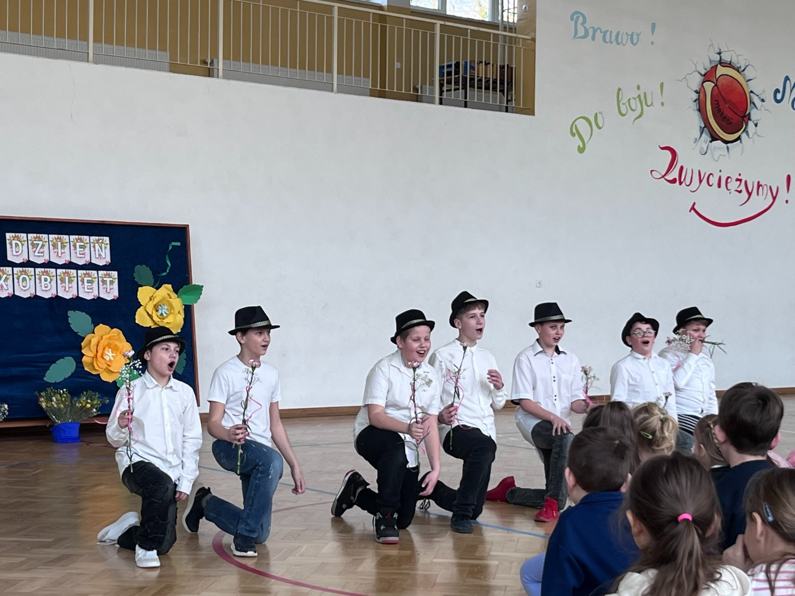 Było to wyjątkowe wydarzenie, podczas którego uczniowie klas 4–8 przygotowali dla wszystkich pań piękny program artystyczny. Podczas uroczystości mogliśmy podziwiać występy uczniów, którzy zaprezentowali tańce współczesne, piosenki oraz wiersze. Występ został nagrodzony gromkimi brawami, a całość wprowadziła wszystkich w radosny i uroczysty nastrój. W wydarzeniu uczestniczyły także mamy z Rady Rodziców. Przedstawicielka Rady złożyła wszystkim kobietom serdeczne życzenia, dziękując za ich codzienną pracę, troskę i zaangażowanie. Nie zabrakło również miłych gestów, wszystkie panie otrzymały kwiaty oraz słodkie upominki, które były wyrazem wdzięczności i szacunku. To spotkanie było piękną okazją do wspólnego świętowania oraz okazania wdzięczności wszystkim kobietom w naszej szkolnej społeczności.