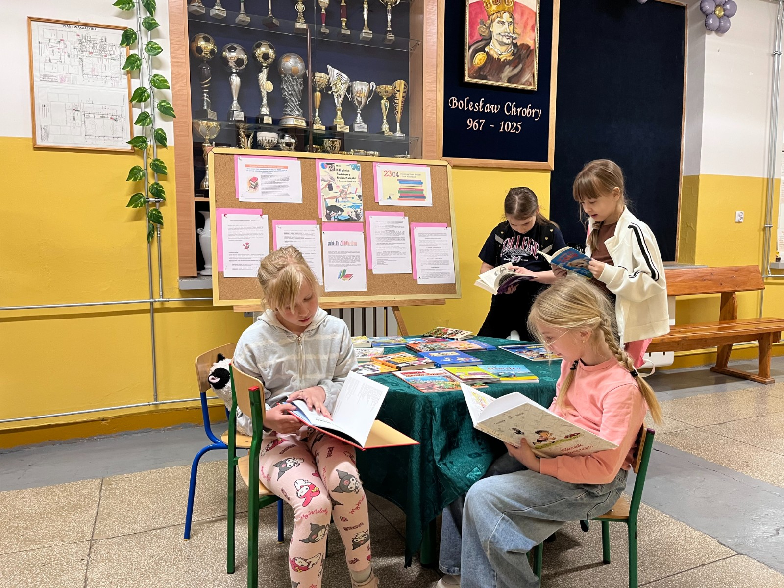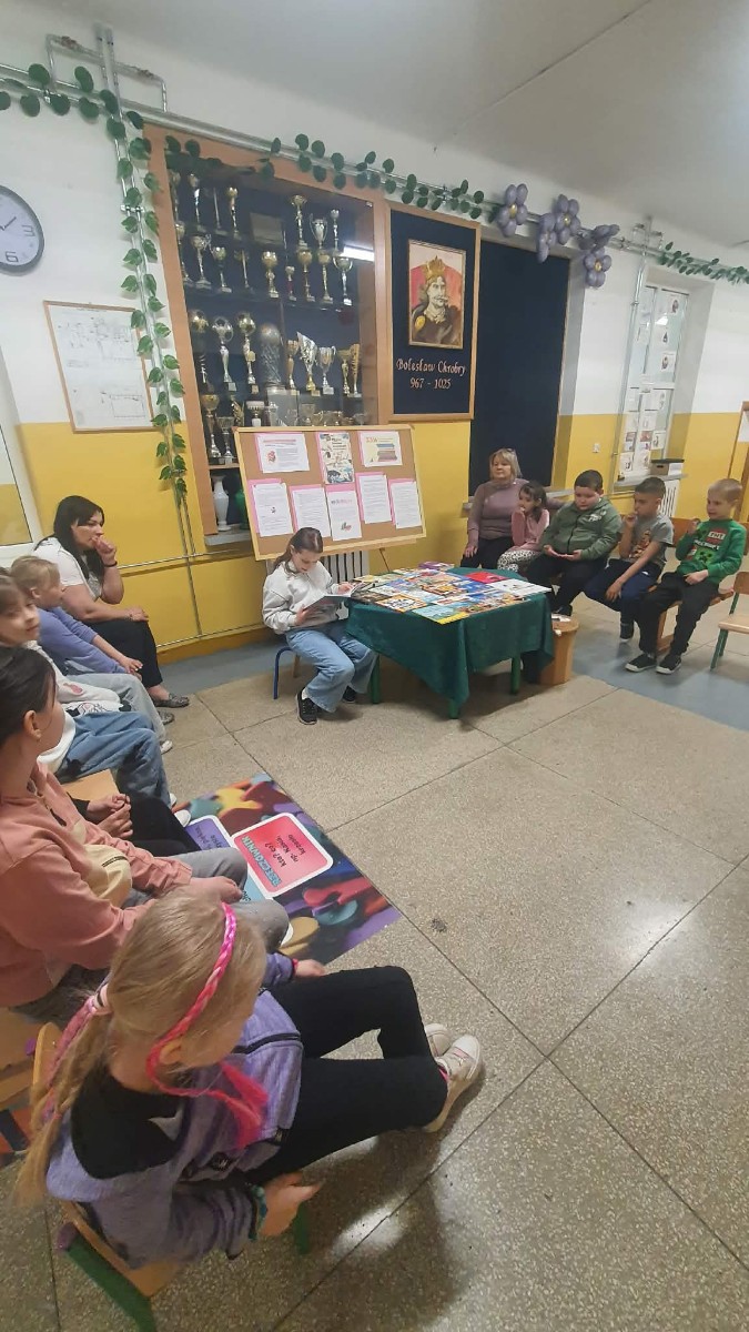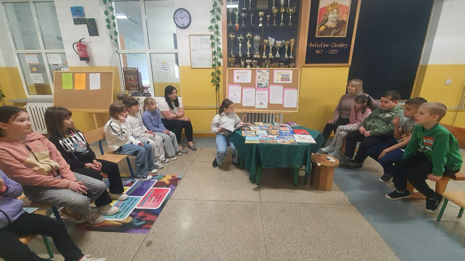 Nad przebiegiem całego wydarzenia czuwała pani Julita Jonaszek, nasza szkolna bibliotekarka, która zadbała o to, by ten dzień był wyjątkowy i pełen literackich wrażeń. Jedną z głównych atrakcji był maraton czytania. Starsi uczniowie z zaangażowaniem czytali książki przedszkolakom, wprowadzając ich w świat wyobraźni i pokazując, jak wiele radości może dawać wspólna lektura. Młodsi słuchacze z zaciekawieniem śledzili losy bohaterów, a atmosfera była pełna skupienia i uśmiechu. Tego dnia można było zauważyć także wzmożone zainteresowanie szkolną biblioteką. Uczniowie znacznie częściej niż zwykle odwiedzali to miejsce, chętnie wypożyczali książki i rozmawiali o swoich ulubionych tytułach. Była to doskonała okazja, by przypomnieć, jak ważną rolę odgrywa czytanie w naszym życiu. Obchody Światowego Dnia Książki pokazały, że książki wciąż mają swoją magiczną moc, a wspólne czytanie potrafi łączyć ludzi w każdym wieku.