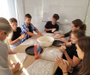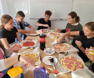 Dodatkową atrakcją była piosenka pt. „Bohater”, wykonana dla kolegów przez koleżanki. Zaśpiewały ją Estera Saczewska – uczennica kl. IV oraz Natalia Stopa – uczennica kl. V. Urozmaiceniem tego dnia była muzyka, którą można było usłyszeć na szkolnym korytarzu w czasie przerw. Oprócz szkolnych obchodów, odbyło się również klasowe świętowanie tego dnia. Uczniowie klas I-III oraz kl. VI delektowali się smakiem pizzy dowiezionej do naszej szkoły, szóstoklasiści grali również w gry planszowe. Uczniowie kl. IV i V pod opieką pań: Irminy Berlickiej oraz Alicji Petryckiej rozpalili ognisko, na którym można było upiec smaczne kiełbaski. Natomiast najstarsi uczniowie z kl. VII postanowili zabawić się w kucharzy i sami upiec pizzę. Pomysł okazał się bardzo trafiony, ponieważ pizza wyszła pyszna, a zabawa przy jej wykonaniu jeszcze bardziej zintegrowała klasę. Pragniemy serdecznie podziękować p. Magdalenie Fuks i p. Annie Śliwie za pomoc przy pieczeniu pizzy oraz pyszne rogaliki i babeczki, które panie przygotowały specjalnie na tę okazję.