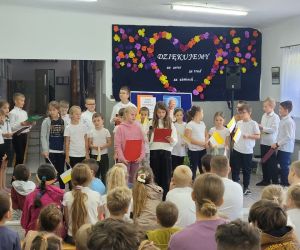 Podczas Akademii wysłuchaliśmy fragmentów przemówień, jakie Ojciec św. wygłosił podczas pielgrzymek po wszystkich kontynentach. Szczególnie dziś jego nauczanie jest głośnym apelem w obronie życia, gdy na świecie, w zawierusze wojennej ginie wiele istnień ludzkich, gdy życie człowieka nie ma wartości. Dlatego tak ważne jest, aby na nowo ludzkość podjęła wysiłek budowania pokoju na całym świecie, aby dzieci miały możliwość bezpiecznego życia i nauki, były szczęśliwe i żyły w szczęśliwych rodzinach, a dorośli mogli wykonywać swoją pracę, która przyczyni się do rozwoju społecznego narodu. Troska o pokój i prawa człowieka była tematem wystąpienia św. Jana Pawła II na forum ONZ, gdzie nawoływał do zakończenia wojen i rewolucji. Przypominał także, jak ważna jest kultura, od której zależy nasza wolność oraz o tym, że każda chwila jest cenna. Uczymy się tego codziennie, a wojna na Ukrainie przypomina nam o tym jeszcze mocniej. Święty Jan Paweł II nie tylko podczas swoich pielgrzymek, ale przez cały swój pontyfikat głosił prawdę że dobro, wolność i życie zawsze zwyciężą. Szacunek dla życia był tematem wielu spotkań z przedstawicielami różnych zawodów, przekonań czy religii, nawet niechrześcijańskich. Papież zawsze szukał porozumienia i apelował do ludzkich sumień oraz stawał w obronie życia i pokoju. Podczas akademii uczniowie wykonali piosenki pt. ,,Biały Pielgrzym” i ,,Abba Ojcze” oraz wiersz Karola Wojtyły pt. ,,O słońcu niewyczerpanym”.