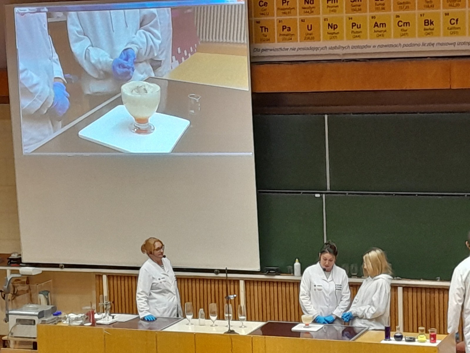 Prowadzący pokazy z uczennicą prezentują spieniony płyn w pucharku na ekranie