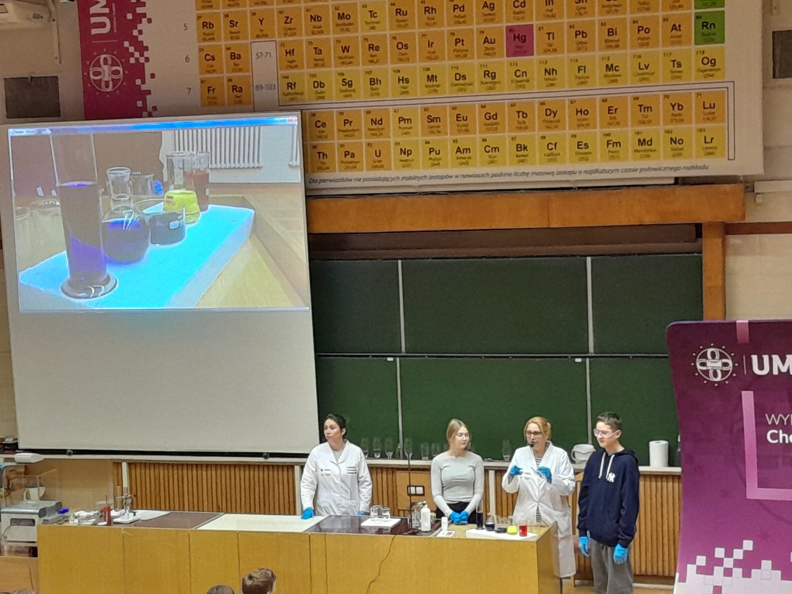 Prowadzący i uczniowie na tle ekranu ukazującego pojemniki z kolorowymi płynami
