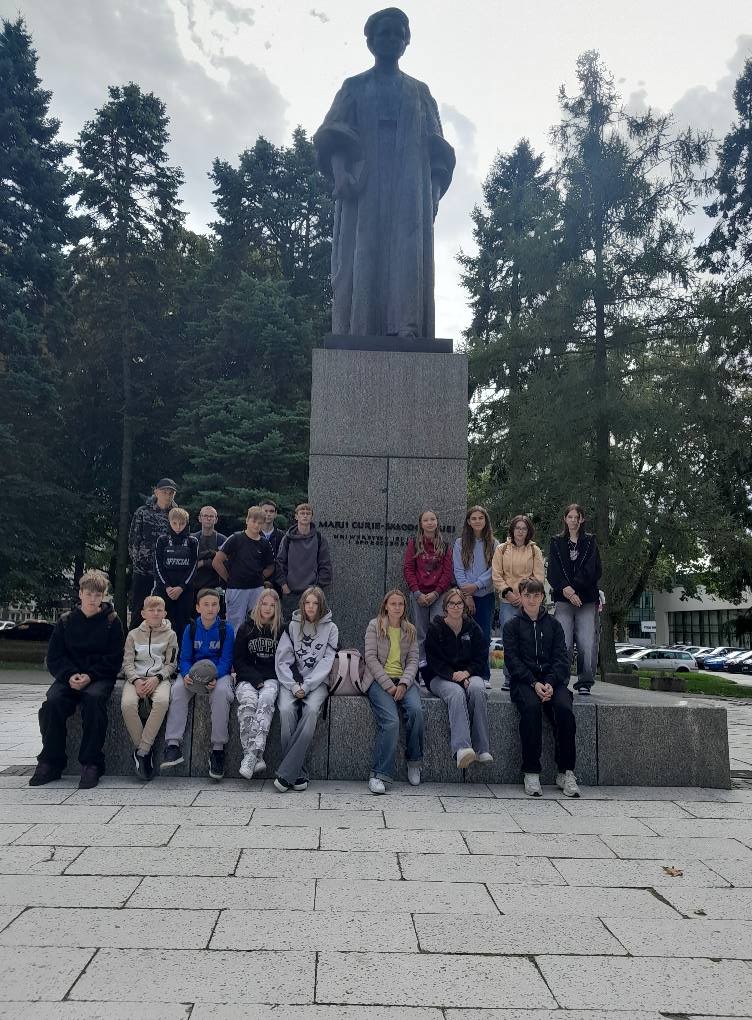 Uczestnicy wycieczki z opiekunami przy pomniku Marii Curie-Skłodowskiej