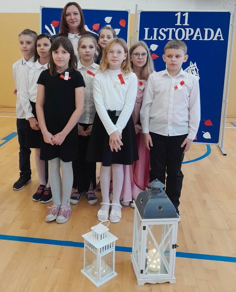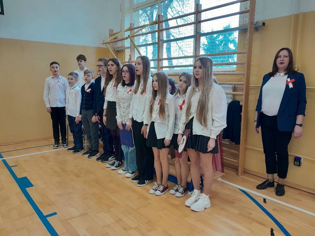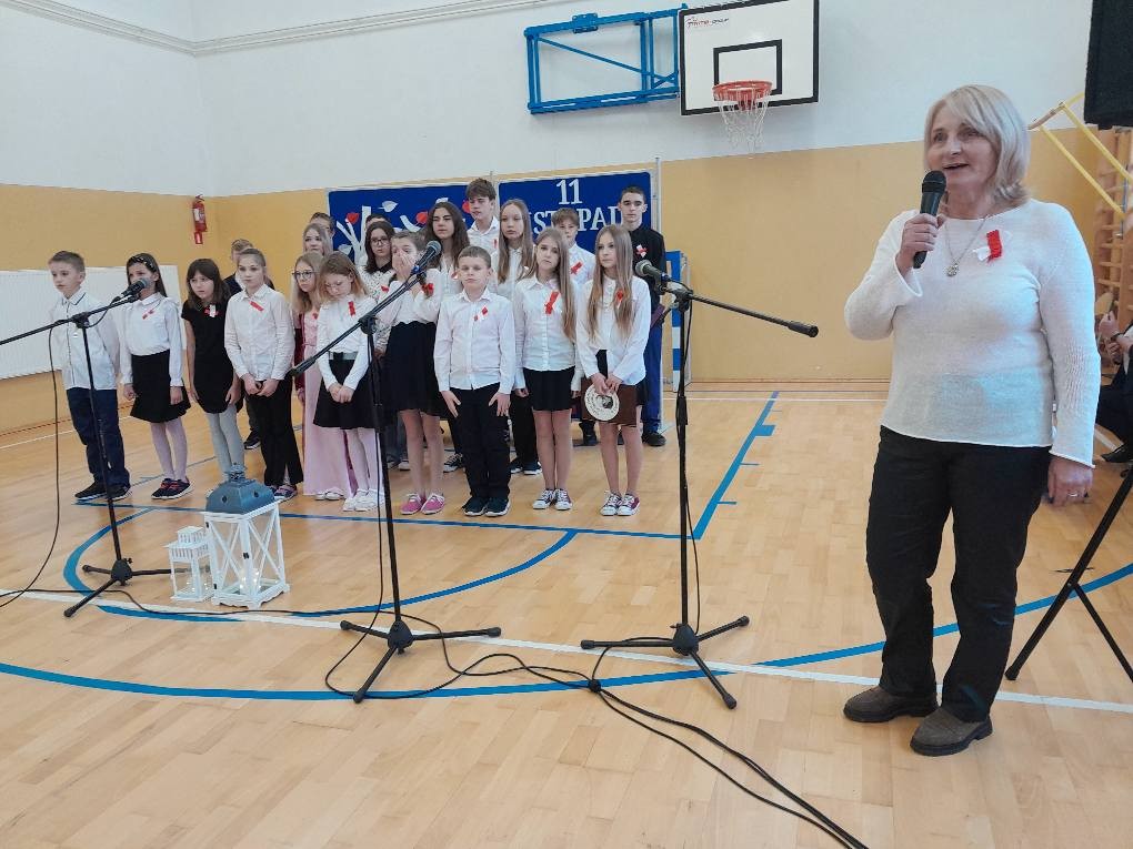 Uczniowie klasy czwartej, piątej i siódmej z nauczycielką przygotowującą uroczystość śpiewają hymn państwowy