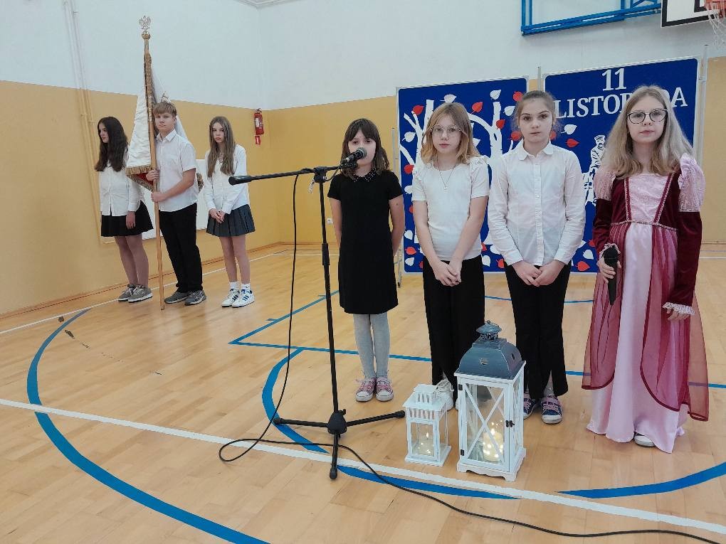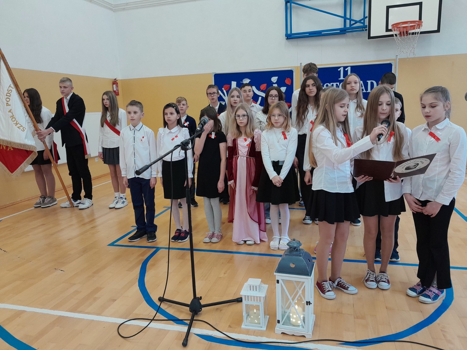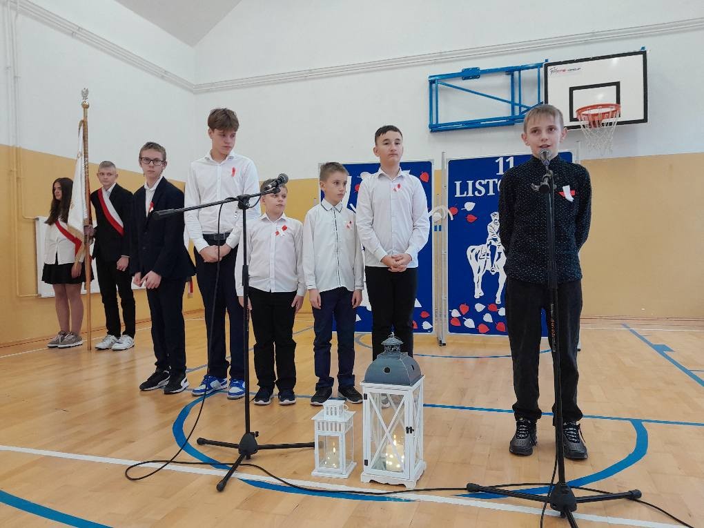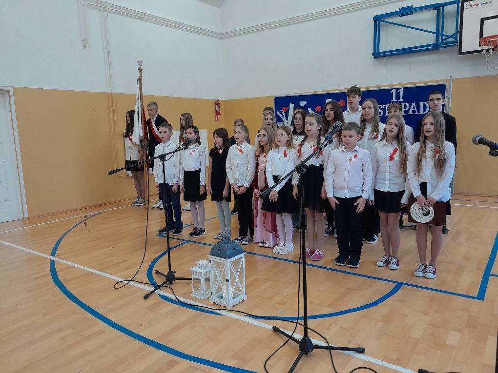 Uczniowie klasy czwartej i piątej przy mikrofonach, z małymi flagami Polski w dłoniach