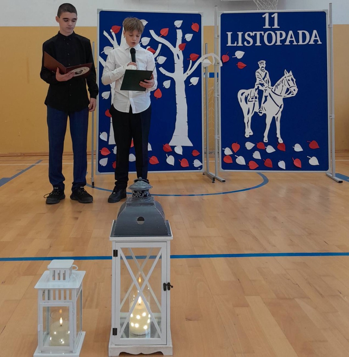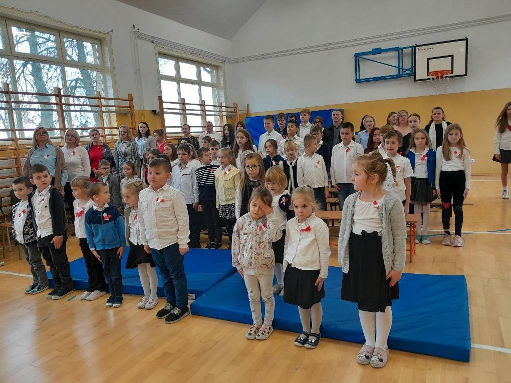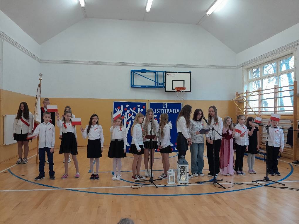 Dziś w naszej szkole odbyła się akademia, podczas której uczniowie z klasy IV, V i VII wprowadzili widzów w tą podniosłą atmosferę. Pieśni, piosenki, wiersze zaprezentowane przez uczniów podkreślały nastrój walki o niepodległość. Wszyscy uczniowie, nawet Ci najmłodsi z zerówki wykazali dziś szacunek dla historii, patriotyzmu poprzez strój i kotyliony w narodowych barwach.