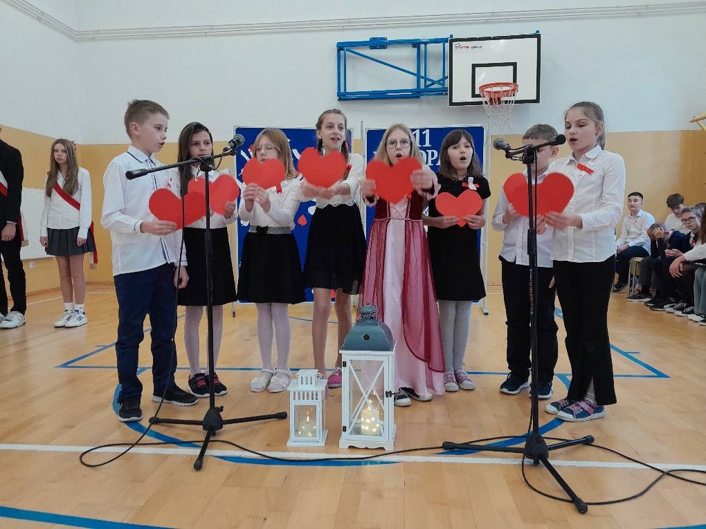 Uczniowie klasy czwartej przy mikrofonach, trzymają czerwone papierowe serca w dłoniach