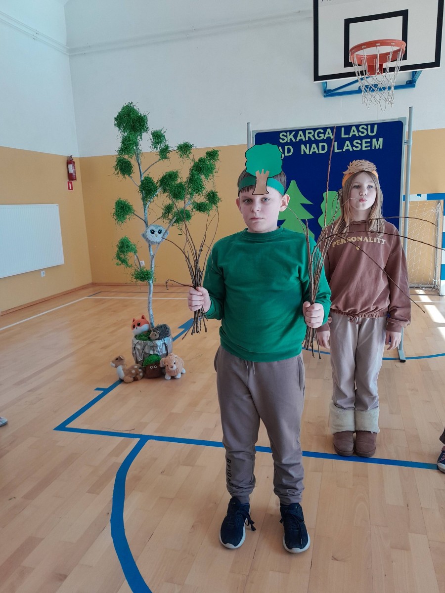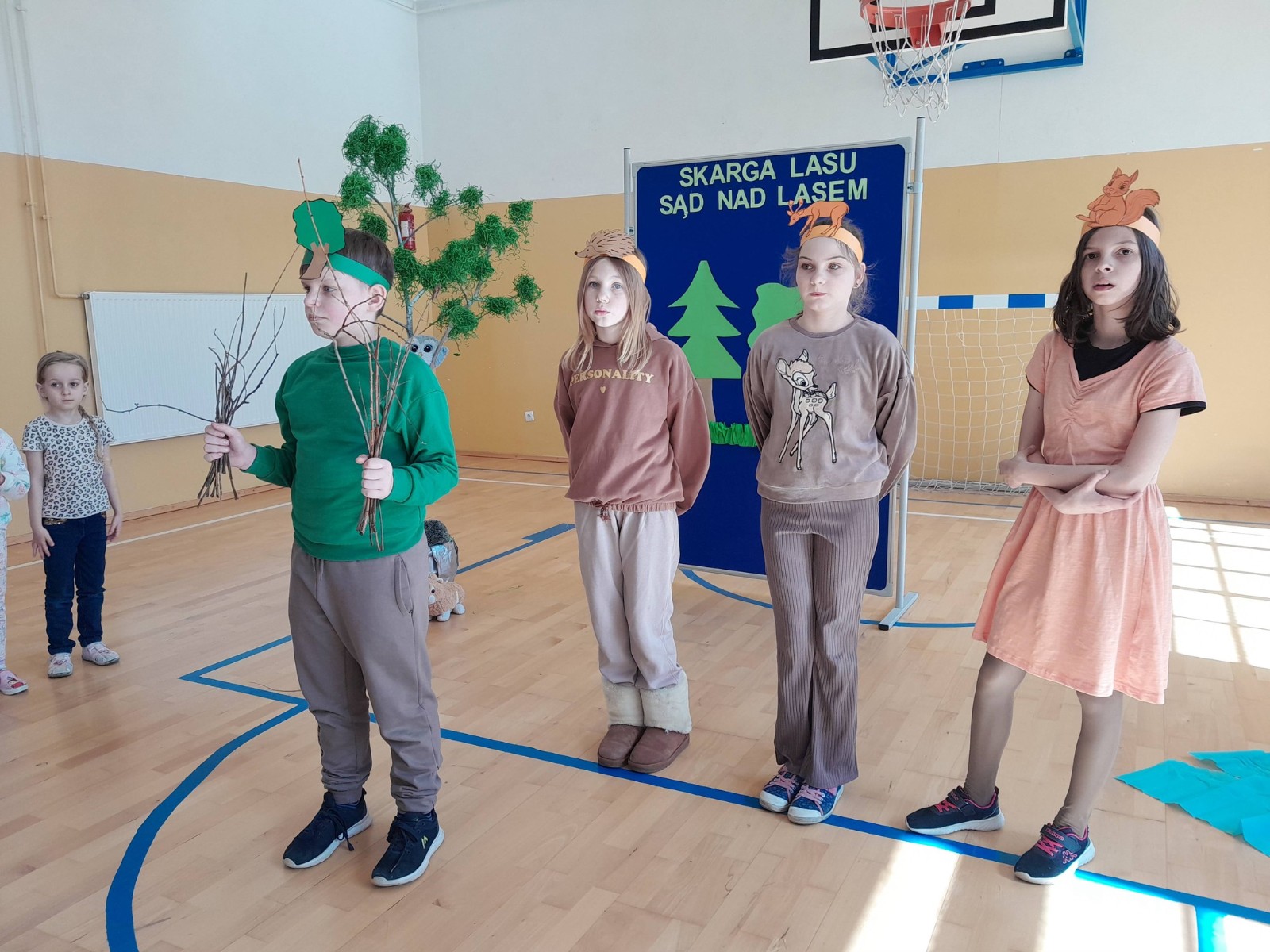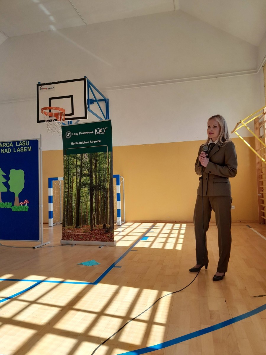 Z tej okazji naszą szkołę odwiedziła dziś pani leśnik Patrycją Jakubowska z Nadleśnictwa Strzelce. Opowiadała o właściwym zachowaniu w lesie, występujących tam roślinach i zwierzętach. Chętnie odpowiadała na pytania uczniów. Prelekcja poprzedzona była krótkim występem artystycznym w wykonaniu uczniów czwartej klasy.
