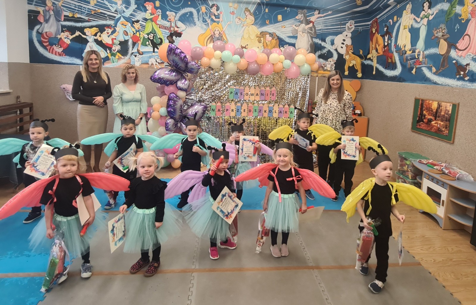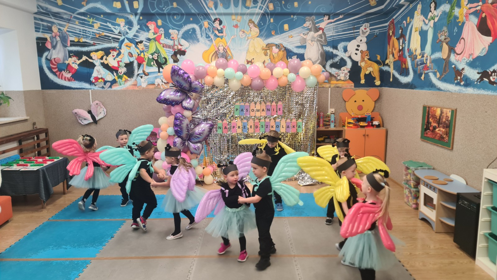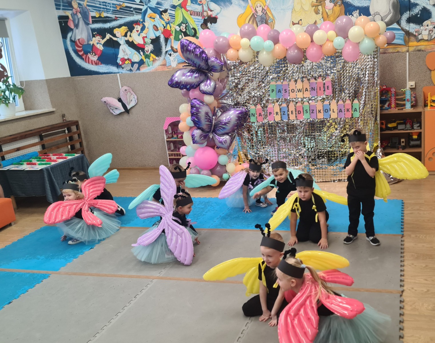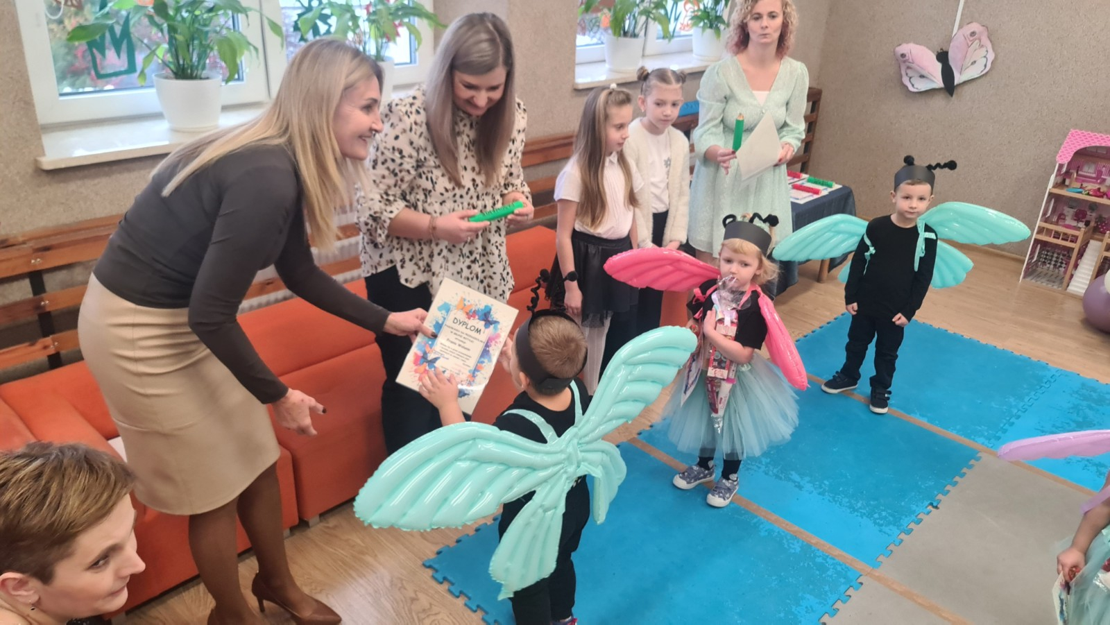 Przedszkolaki w strojach motyli tańczą przy muzyce