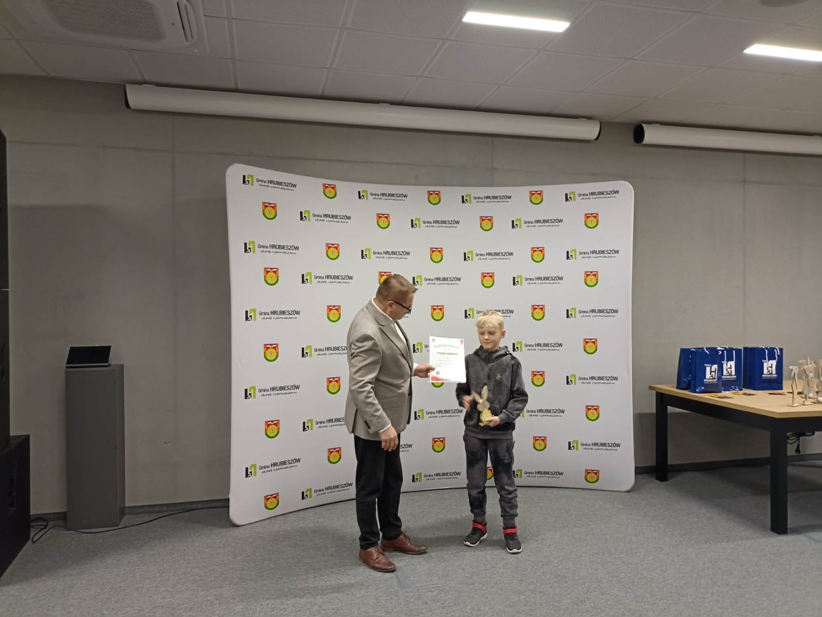 Uczeń prezentuje dyplom i nagrodę po zakończeniu konkursu, stojąc obok przedstawiciela władz gminy.