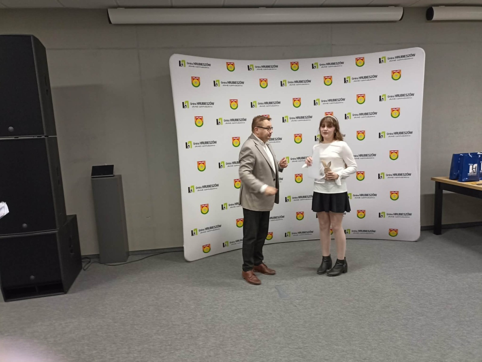 Uczennica prezentuje dyplom i nagrodę po zakończeniu konkursu, stojąc obok przedstawiciela władz gminy.