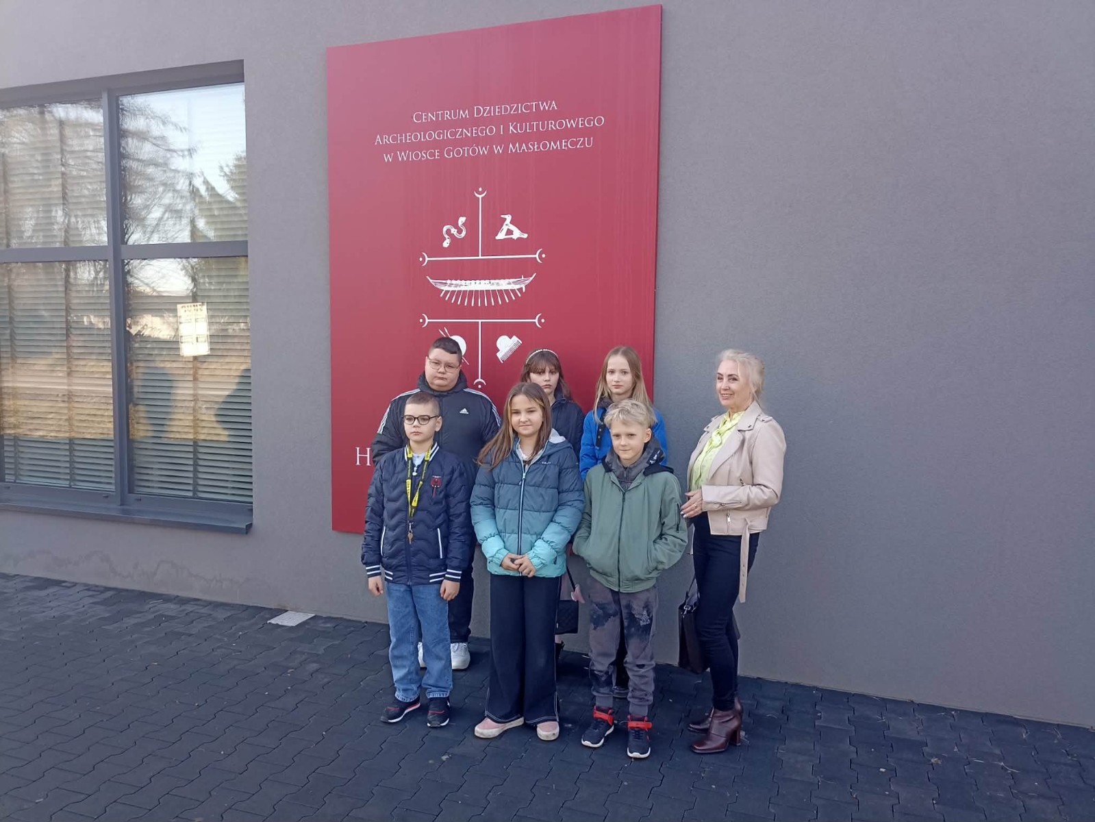 Grupa uczniów wraz z opiekunem stoi przed budynkiem Centrum Dziedzictwa Archeologicznego i Kulturowego w Masłomęczu.