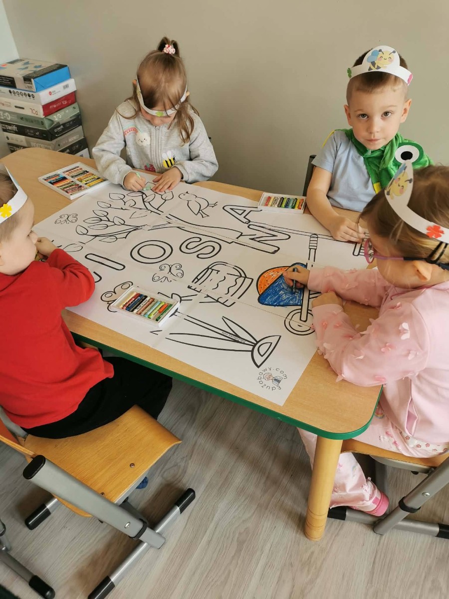 Dzieci siedzą przy stoliku i kolorują dużą wspólną pracę plastyczną związaną z wiosną, korzystając z kredek.