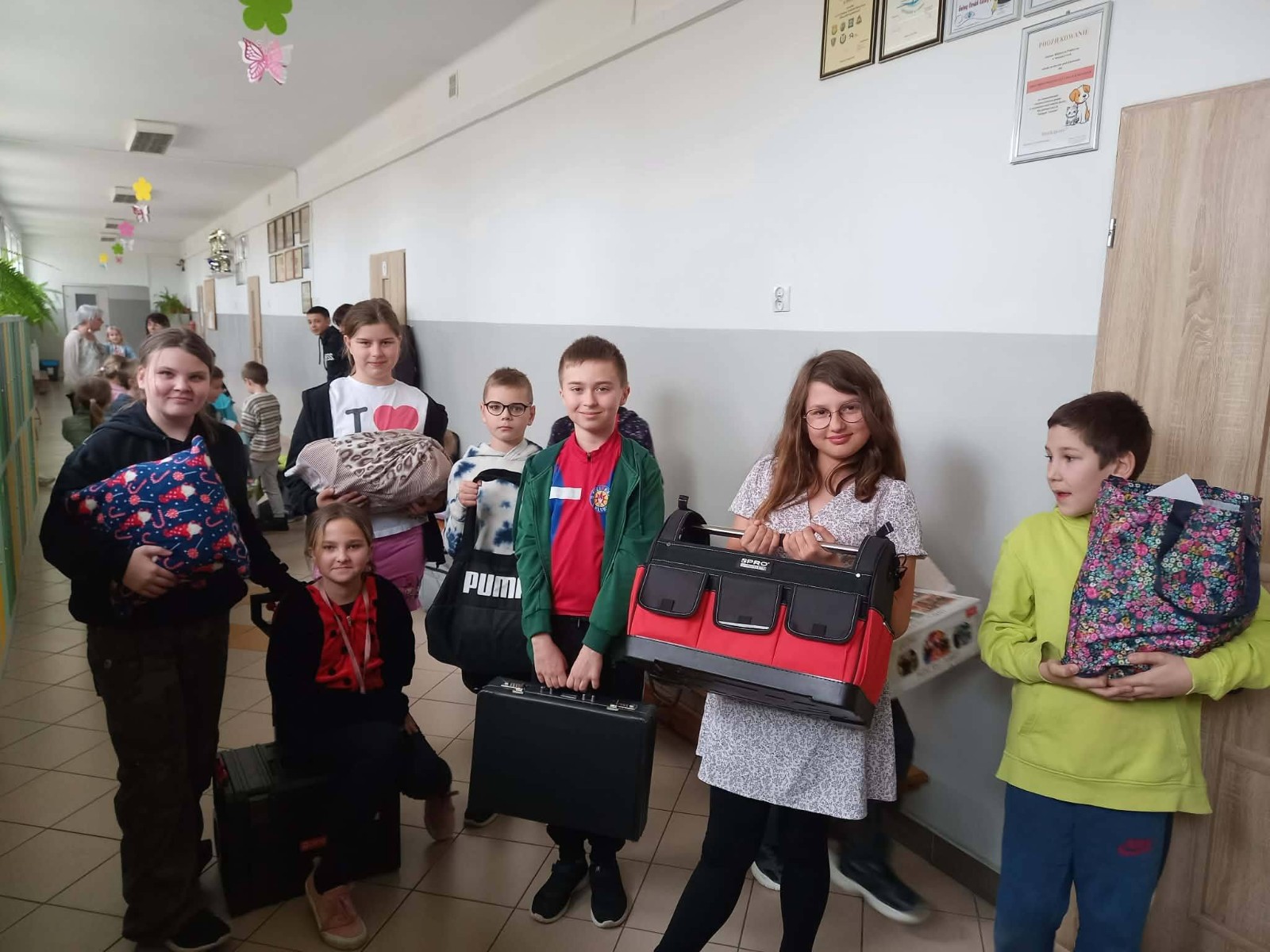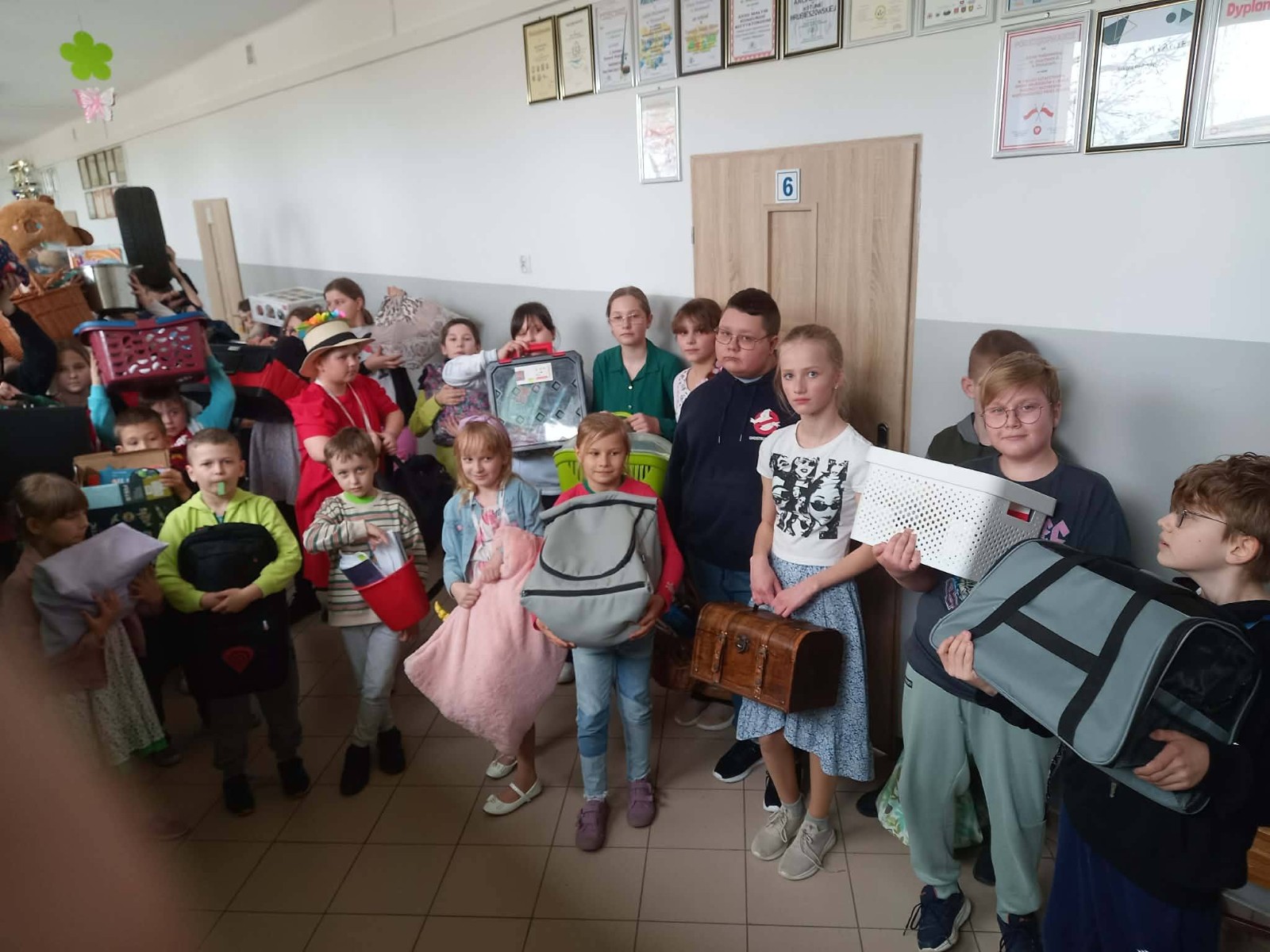 Uczniowie ustawieni na korytarzu trzymają różnorodne przedmioty użyte zamiast plecaków, pokazując swoją kreatywność.