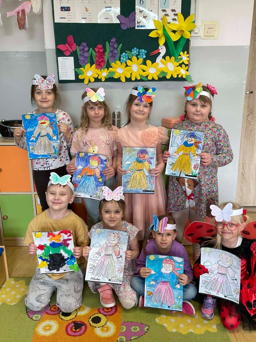 Dzieci z oddziału przedszkolnego prezentują wykonane prace plastyczne przedstawiające postać Marzanny oraz wiosenne motywy.