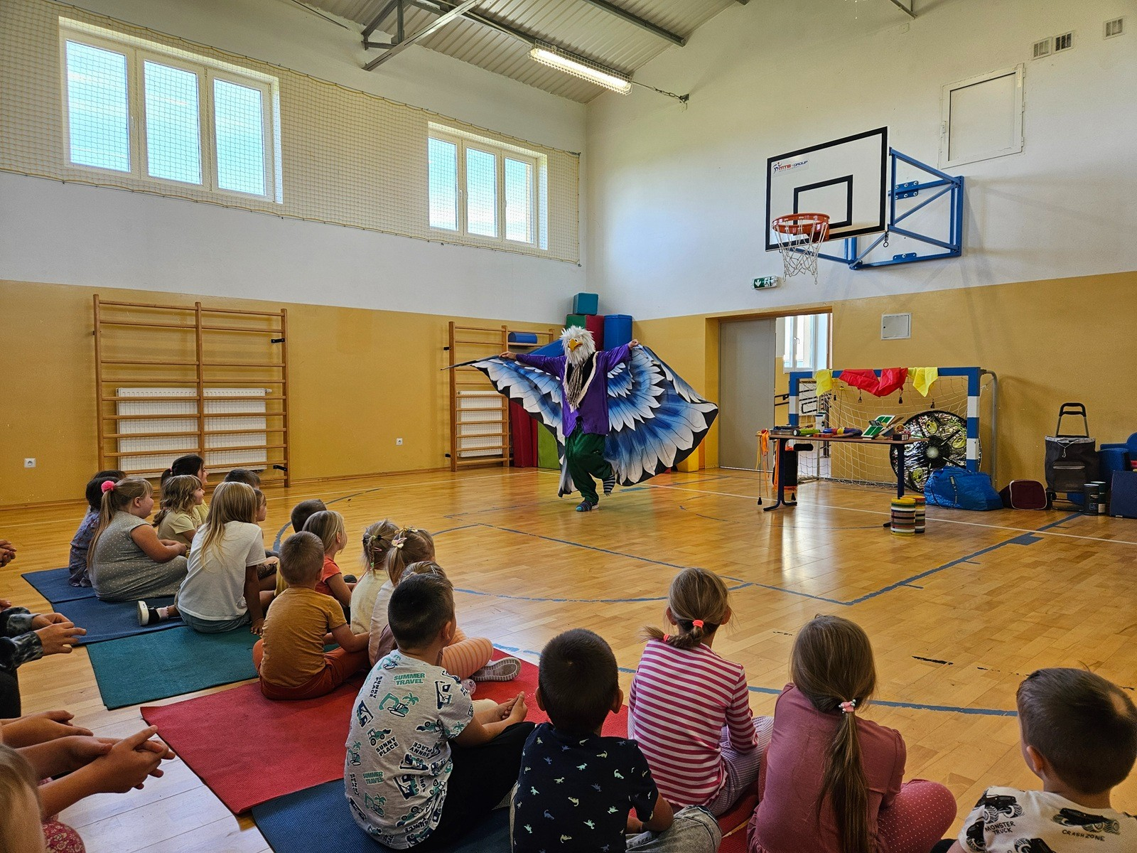 Klaun Walduś w stroju z dużymi skrzydłami występuje przed całą grupą dzieci i uczniów siedzących na sali gimnastycznej.