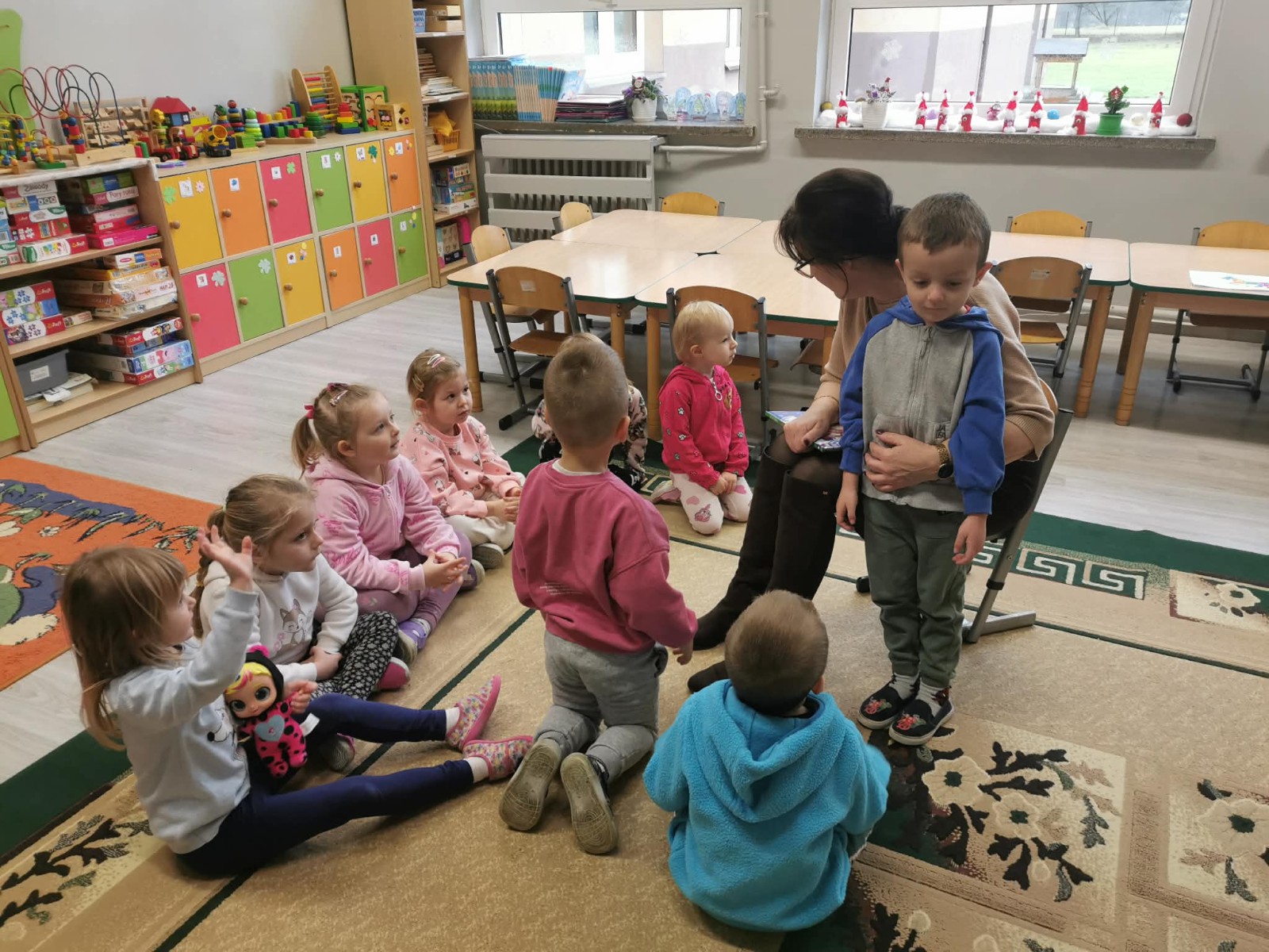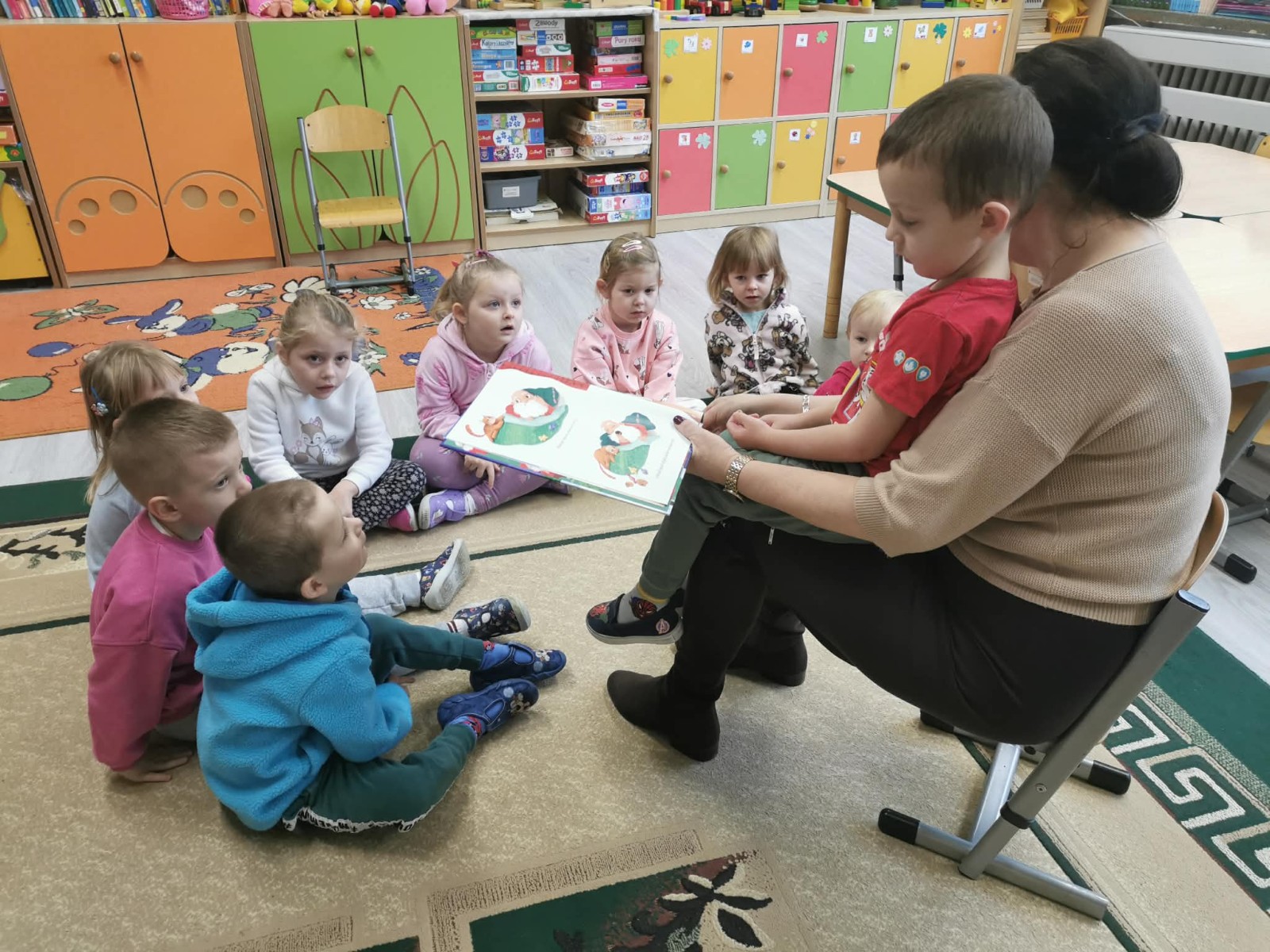 Grupa przedszkolaków siedzi na dywanie, a pani czyta im opowiadanie o Mikołaju; jedno z dzieci siedzi na jej kolanach.