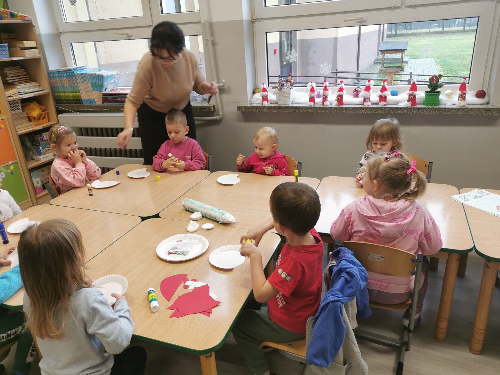 Pani pomaga dzieciom podczas zajęć plastycznych, dzieci pracują nad elementami portretu Mikołaja.