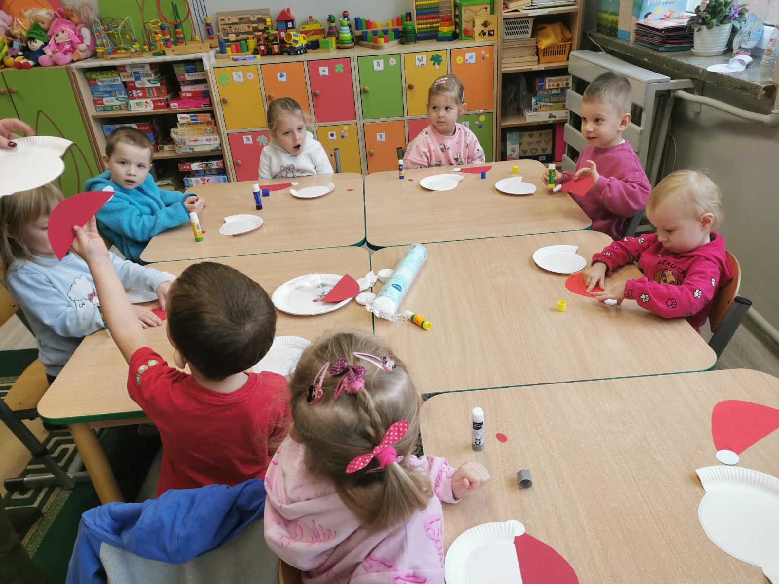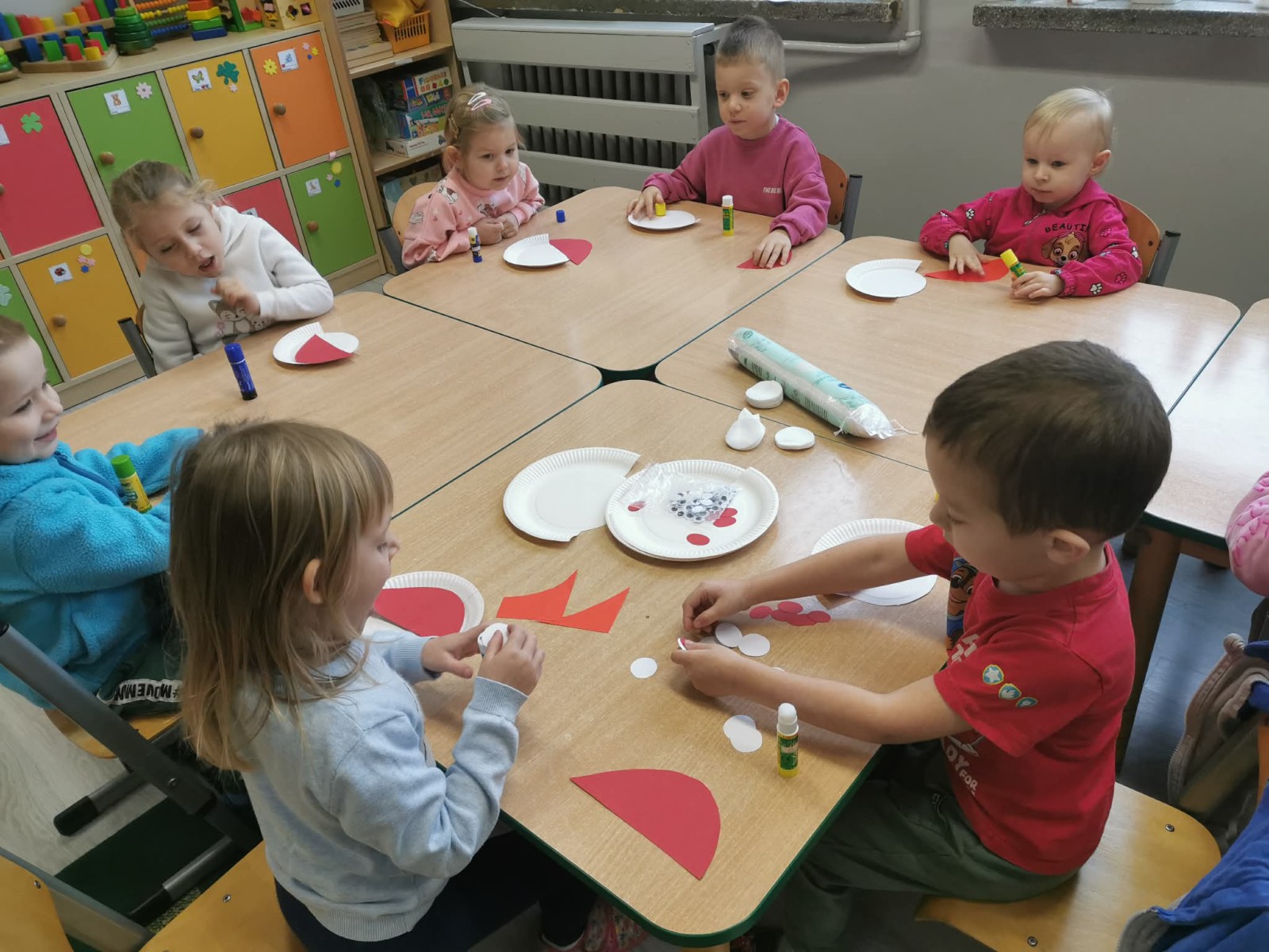 Przedszkolaki siedzą przy stolikach i wykonują prace plastyczne przedstawiające Mikołaja z papierowych talerzyków i płatków kosmetycznych.