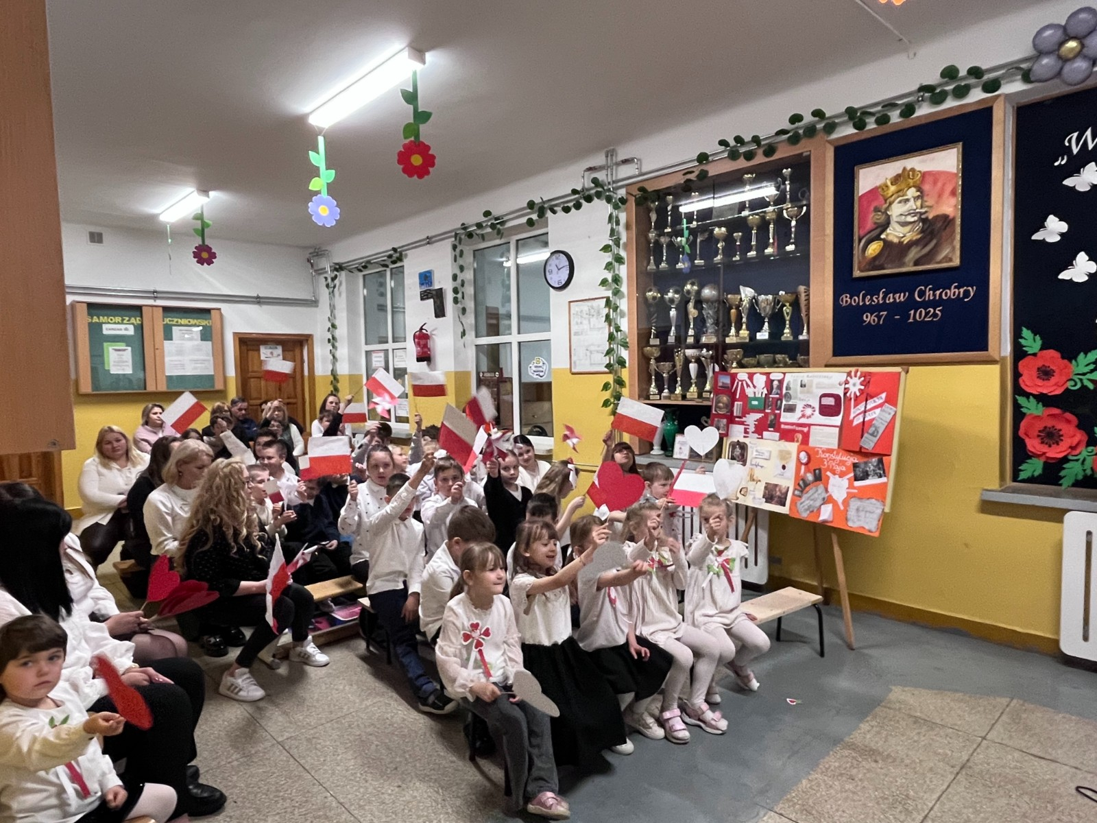Wydarzenie rozpoczęło się wprowadzeniem pocztu sztandarowego, co nadało całej uroczystości podniosły i wyjątkowy charakter. Następnie wszyscy zebrani wspólnie odśpiewali hymn narodowy, oddając szacunek symbolom państwowym. Kolejnym punktem programu był montaż słowno-muzyczny przygotowany przez uczniów klas 4-8. Występ poruszał ważne treści patriotyczne, przypominając o historii i wartościach, które są fundamentem naszej tożsamości narodowej. Szczególnym momentem uroczystości była obecność przedszkolaków, którzy zaszczycili nas swoim udziałem. Przedszkolaki oraz uczniowie klas 1-3 przybyli z przypiętymi kotylionami, trzymając w dłoniach biało-czerwone flagi. Z entuzjazmem i radością machali nimi w rytm pieśni patriotycznych, wprowadzając do wydarzenia wyjątkowo ciepłą i wzruszającą atmosferę. Nad sprawnym przebiegiem akademii czuwały panie Marlena Chomiak oraz Marta Sienicka. Uroczystość była ważną lekcją patriotyzmu i wspólnoty, która na długo pozostanie w pamięci uczestników.