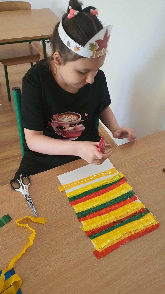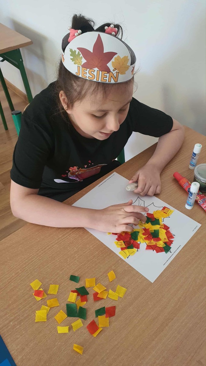 Projekt jest przeznaczony dla przedszkoli, klas 0–8 szkół podstawowych, szkół z oddziałami integracyjnymi i specjalnymi oraz nauczycieli, terapeutów i nauczycieli pracującymi z uczniami z SPE. Projekt to szansa na rozwój kompetencji społecznych, emocjonalnych i twórczych uczniów ze specjalnymi potrzebami edukacyjnymi (SPE) poprzez cykliczne warsztaty łączące plastykę, ruch, zabawę i integrację sensoryczną. Zadania projektowe polegają na zorganizowaniu 4 zajęć-warsztatów dla swoich uczniów, aby otrzymać certyfikat. W projekcie bierze udział uczennica klasy trzeciej Gabrysia pod kierunkiem pani Anny Pałys. Zadanie 1 Szelest barw w dziecięcych dłoniach polegało na stworzeniu pracy plastycznej inspirowanej kolorami spadających liści, kasztanów i jesiennej pogody. Gabrysia wykorzystała do tego różnorodne materiały: farby, kredki, kolorowy papier, bibułę starając się uchwycić piękno jesieni w twórczy, indywidualny sposób „opowiedziała ” swoją jesienną historię kolorem i fakturą .