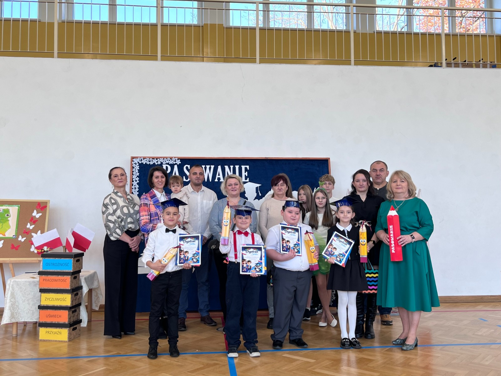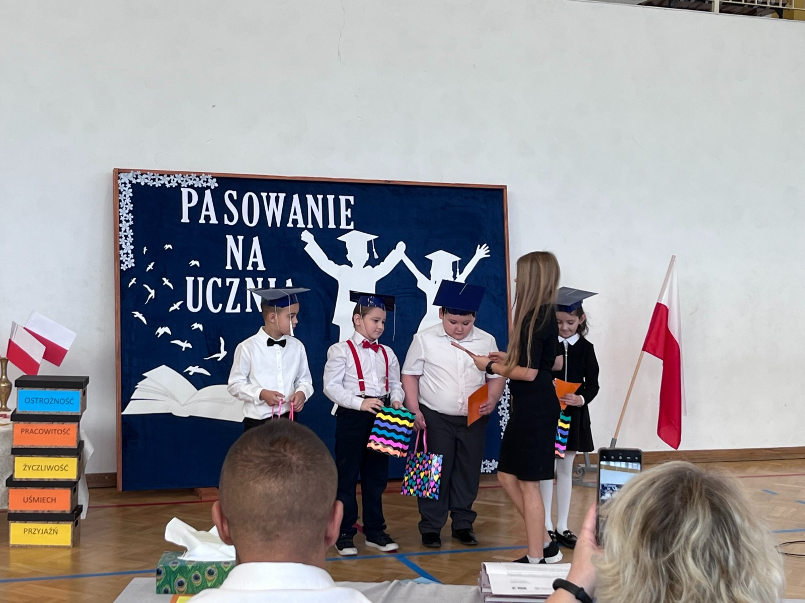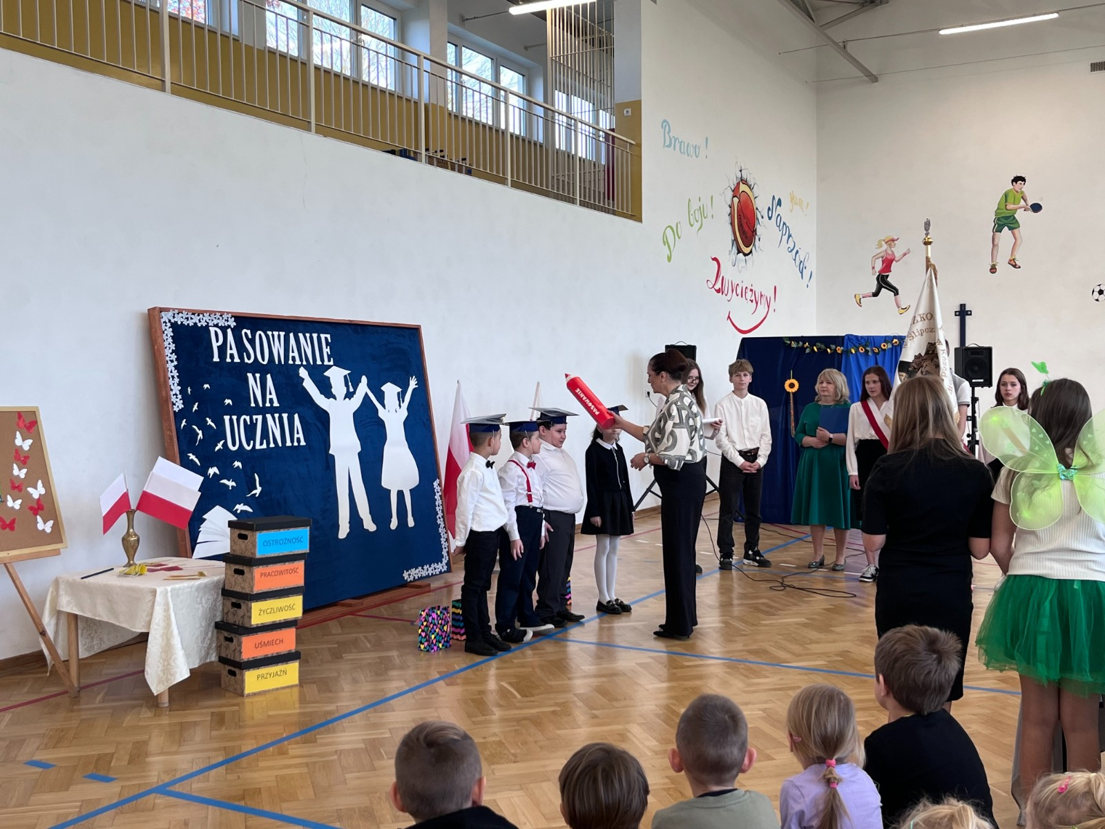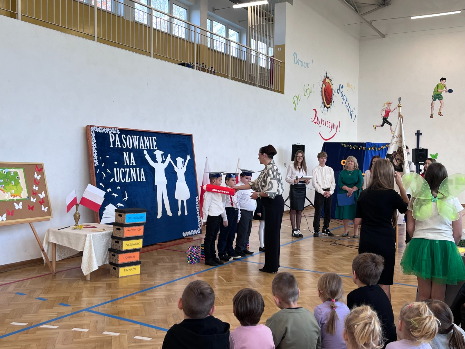 To chwila, na którą z niecierpliwością czekają zarówno najmłodsi uczniowie, jak i ich rodzice oraz nauczyciele. W naszej szkole tegoroczne pasowanie miało szczególnie uroczysty i radosny charakter. Uroczystość rozpoczęła się od zadań sprawdzających umiejętności i wiedzę uczniów. Pierwszaki z dużym przejęciem, ale i ogromnym zaangażowaniem rozwiązywały przygotowane dla nich zadania, udowadniając, że są gotowe do rozpoczęcia szkolnej przygody. Następnie dzieci zaprezentowały wiersze i piosenki, które przygotowywały na tę wyjątkową okazję. Występy były pełne uroku, a na twarzach rodziców nie brakowało wzruszenia i dumy. Podczas uroczystości nie zabrakło także podziękowań skierowanych do rodziców – pierwszaki wręczyły im symboliczne serduszka, wyrażając wdzięczność za wsparcie i codzienną pomoc. Kulminacyjnym momentem uroczystości było wprowadzenie sztandaru szkoły oraz wspólne odśpiewanie hymnu narodowego. W podniosłej atmosferze uczniowie klasy pierwszej uroczyście recytowali tekst ślubowania, deklarując, że będą pilnymi i odpowiedzialnymi uczniami. Następnie pani Dyrektor dokonała pasowania na ucznia. Na zakończenie każde dziecko odbiło pieczątkę palcem – symboliczny znak, że od tego dnia staje się pełnoprawnym uczniem szkoły. Po części oficjalnej głos zabrała pani Dyrektor, kierując ciepłe i pełne życzliwości słowa do pierwszoklasistów oraz ich rodziców. Podkreśliła, jak ważny jest to moment i życzyła dzieciom wielu sukcesów oraz radości ze zdobywania wiedzy. Nie mogło również zabraknąć upominków. Pierwszoklasiści otrzymali prezenty od swoich rodziców, uczniów klasy drugiej oraz przedszkolaków, którzy z ogromną sympatią powitali ich w gronie starszych kolegów. Ponadto uczniowie otrzymali pamiątkowe książki od Instytutu Książki z kampanii "Mała książka-wielki człowiek". Uroczystość zakończyła się wspólnym, pamiątkowym zdjęciem oraz słodkim poczęstunkiem. Największą niespodzianką był przepiękny tort przygotowany przez rodziców specjalnie dla pierwszaków. Był to smakowity finał pełnego emocji i wzruszeń dnia. Pasowanie na ucznia to ważny krok na drodze edukacyjnej każdego dziecka. Nasi pierwszoklasiści pokazali, że są gotowi podjąć szkolne wyzwania, a cała społeczność szkolna z dumą wprowadziła ich w ten nowy, fascynujący etap życia. Życzymy im, aby każdy kolejny dzień w szkole przynosił wiele radości, odkryć i sukcesów!