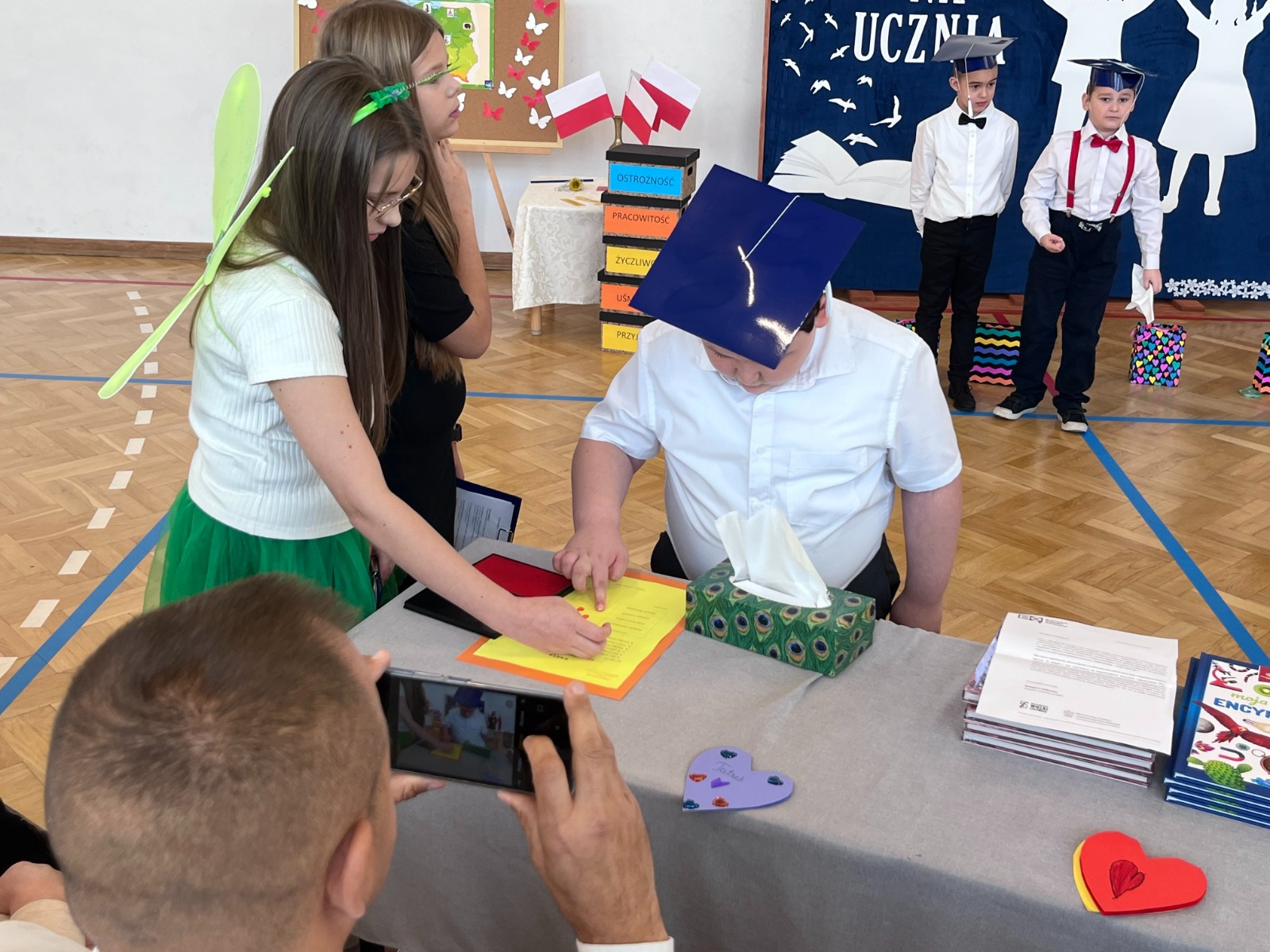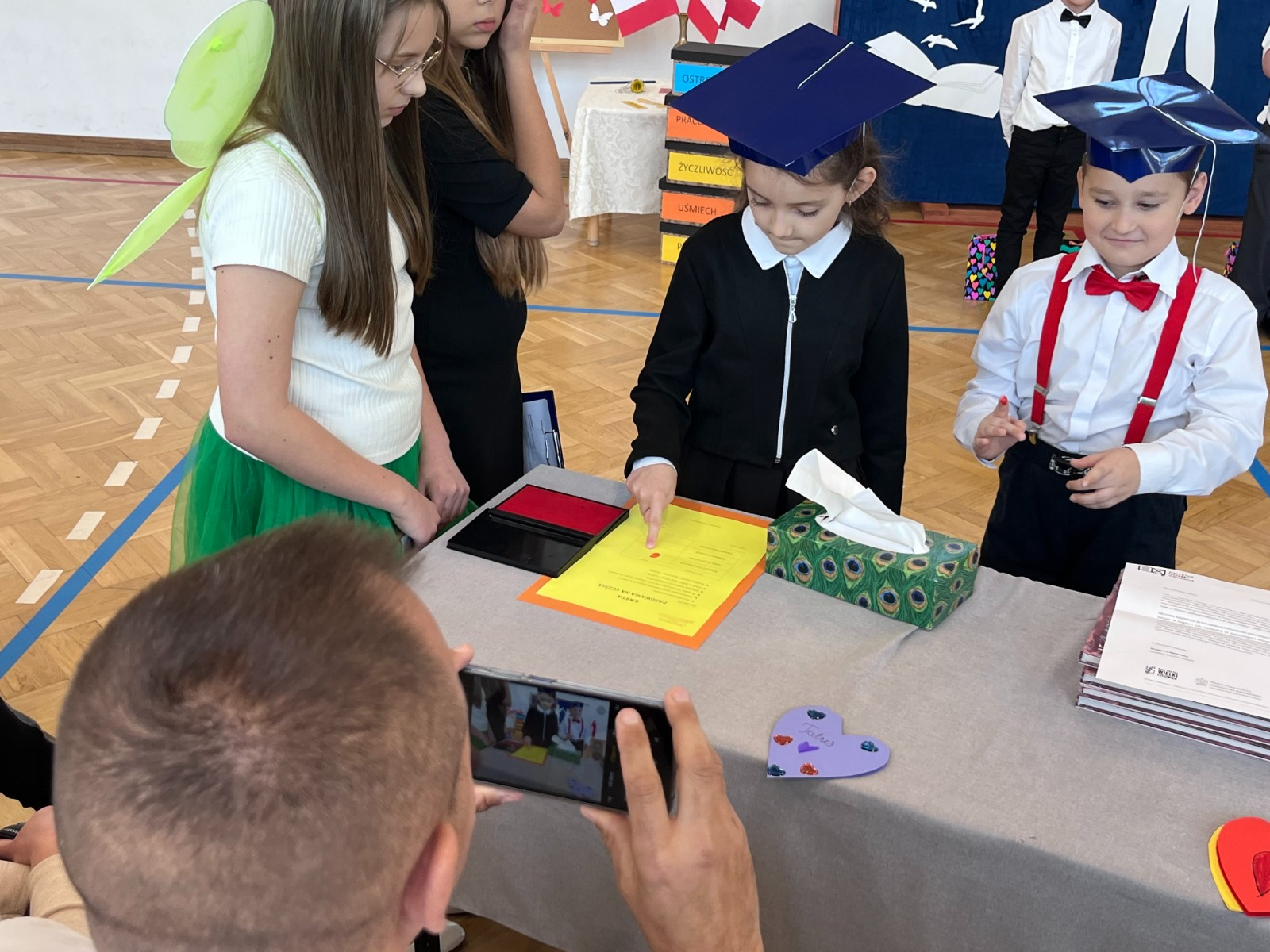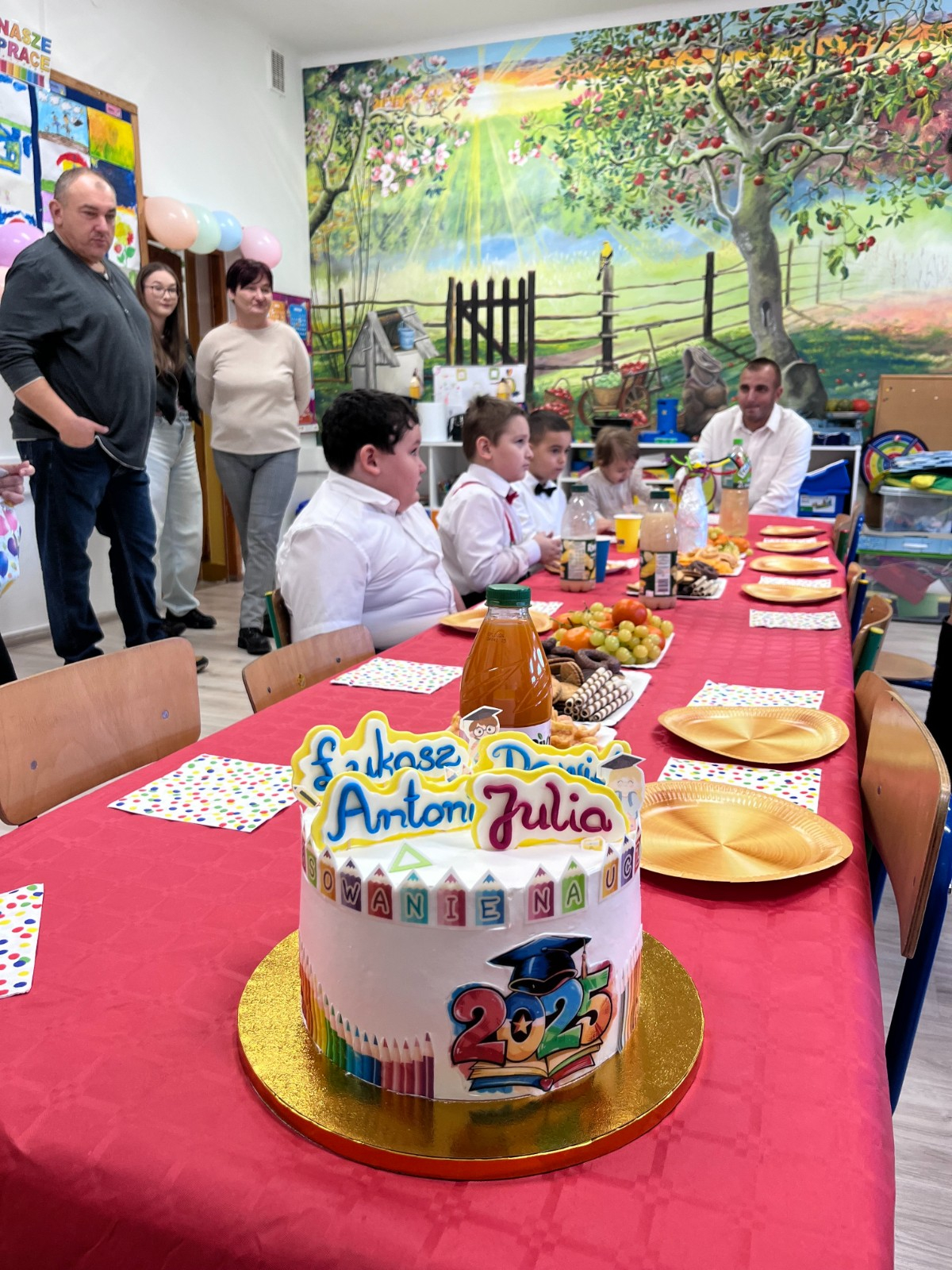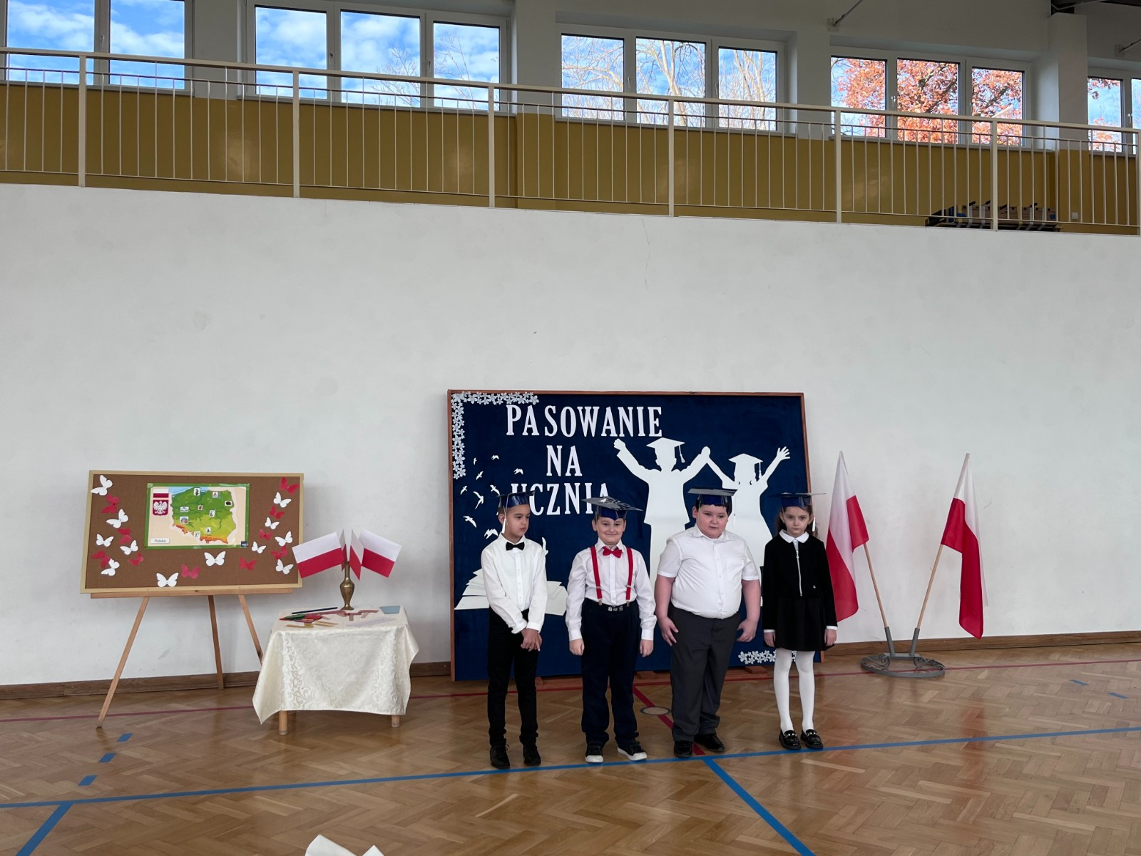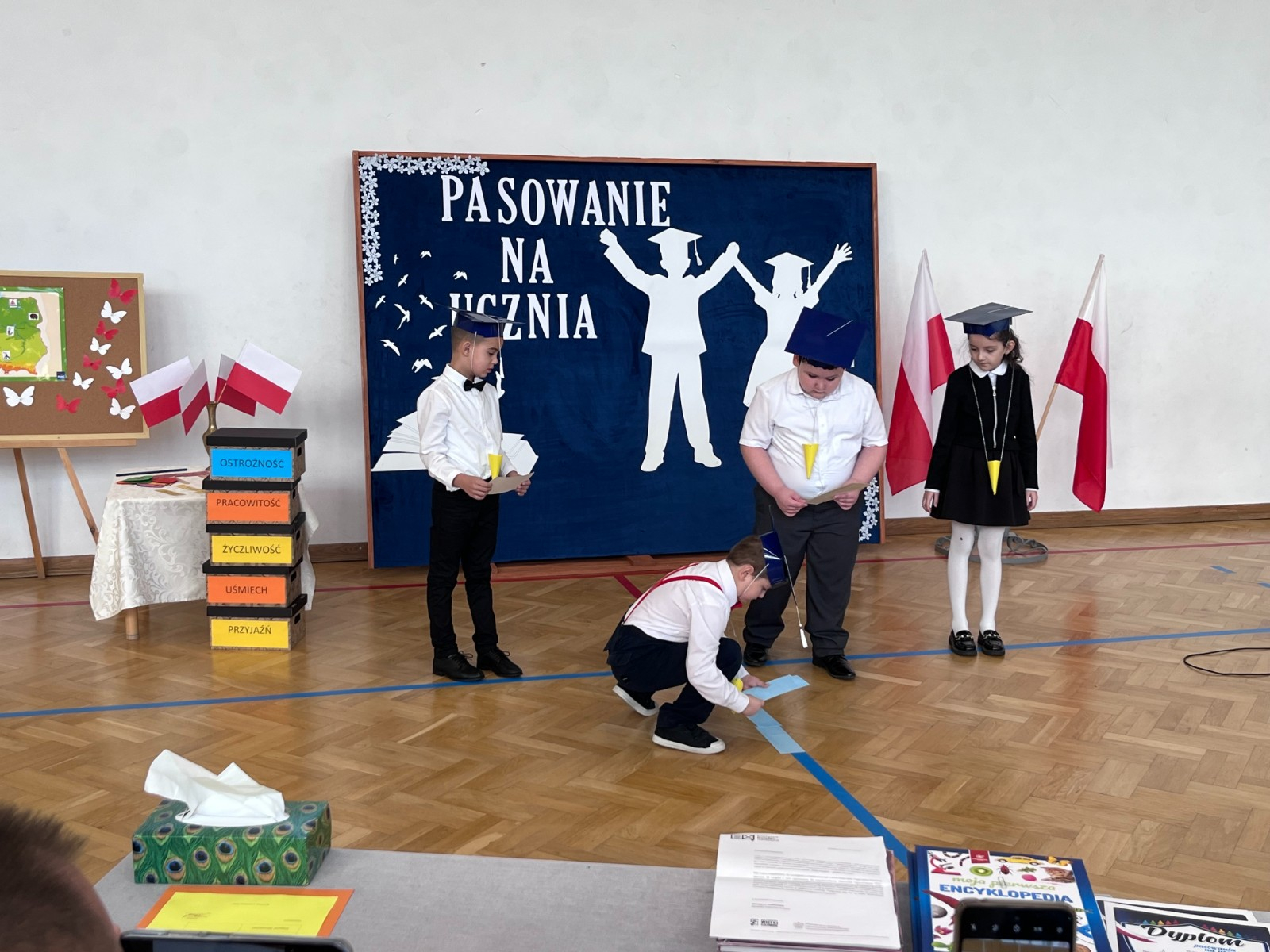 To chwila, na którą z niecierpliwością czekają zarówno najmłodsi uczniowie, jak i ich rodzice oraz nauczyciele. W naszej szkole tegoroczne pasowanie miało szczególnie uroczysty i radosny charakter. Uroczystość rozpoczęła się od zadań sprawdzających umiejętności i wiedzę uczniów. Pierwszaki z dużym przejęciem, ale i ogromnym zaangażowaniem rozwiązywały przygotowane dla nich zadania, udowadniając, że są gotowe do rozpoczęcia szkolnej przygody. Następnie dzieci zaprezentowały wiersze i piosenki, które przygotowywały na tę wyjątkową okazję. Występy były pełne uroku, a na twarzach rodziców nie brakowało wzruszenia i dumy. Podczas uroczystości nie zabrakło także podziękowań skierowanych do rodziców – pierwszaki wręczyły im symboliczne serduszka, wyrażając wdzięczność za wsparcie i codzienną pomoc. Kulminacyjnym momentem uroczystości było wprowadzenie sztandaru szkoły oraz wspólne odśpiewanie hymnu narodowego. W podniosłej atmosferze uczniowie klasy pierwszej uroczyście recytowali tekst ślubowania, deklarując, że będą pilnymi i odpowiedzialnymi uczniami. Następnie pani Dyrektor dokonała pasowania na ucznia. Na zakończenie każde dziecko odbiło pieczątkę palcem – symboliczny znak, że od tego dnia staje się pełnoprawnym uczniem szkoły. Po części oficjalnej głos zabrała pani Dyrektor, kierując ciepłe i pełne życzliwości słowa do pierwszoklasistów oraz ich rodziców. Podkreśliła, jak ważny jest to moment i życzyła dzieciom wielu sukcesów oraz radości ze zdobywania wiedzy. Nie mogło również zabraknąć upominków. Pierwszoklasiści otrzymali prezenty od swoich rodziców, uczniów klasy drugiej oraz przedszkolaków, którzy z ogromną sympatią powitali ich w gronie starszych kolegów. Ponadto uczniowie otrzymali pamiątkowe książki od Instytutu Książki z kampanii "Mała książka-wielki człowiek". Uroczystość zakończyła się wspólnym, pamiątkowym zdjęciem oraz słodkim poczęstunkiem. Największą niespodzianką był przepiękny tort przygotowany przez rodziców specjalnie dla pierwszaków. Był to smakowity finał pełnego emocji i wzruszeń dnia. Pasowanie na ucznia to ważny krok na drodze edukacyjnej każdego dziecka. Nasi pierwszoklasiści pokazali, że są gotowi podjąć szkolne wyzwania, a cała społeczność szkolna z dumą wprowadziła ich w ten nowy, fascynujący etap życia. Życzymy im, aby każdy kolejny dzień w szkole przynosił wiele radości, odkryć i sukcesów!