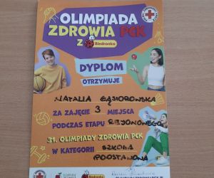To konkurs, którego celem jest wykształcenie wśród młodzieży szkolnej potrzeby dbania o własne zdrowie, promocja nawyków zdrowego odżywiania, ruchu i higieny oraz dbania o środowisko naturalne. Udział w Olimpiadzie przyczynia się do kształtowania wśród uczniów postaw prozdrowotnych i proekologicznych. Nasza uczennica Natalia Gąsiorowska z klasy 8 zajęła 3 miejsce w kategorii szkoła podstawowa. Serdecznie gratulujemy Natalii i życzymy dalszych sukcesów-opiekunowie SK PCK: Julita Jonaszek, Marlena Chomiak i Ilona Nosko.