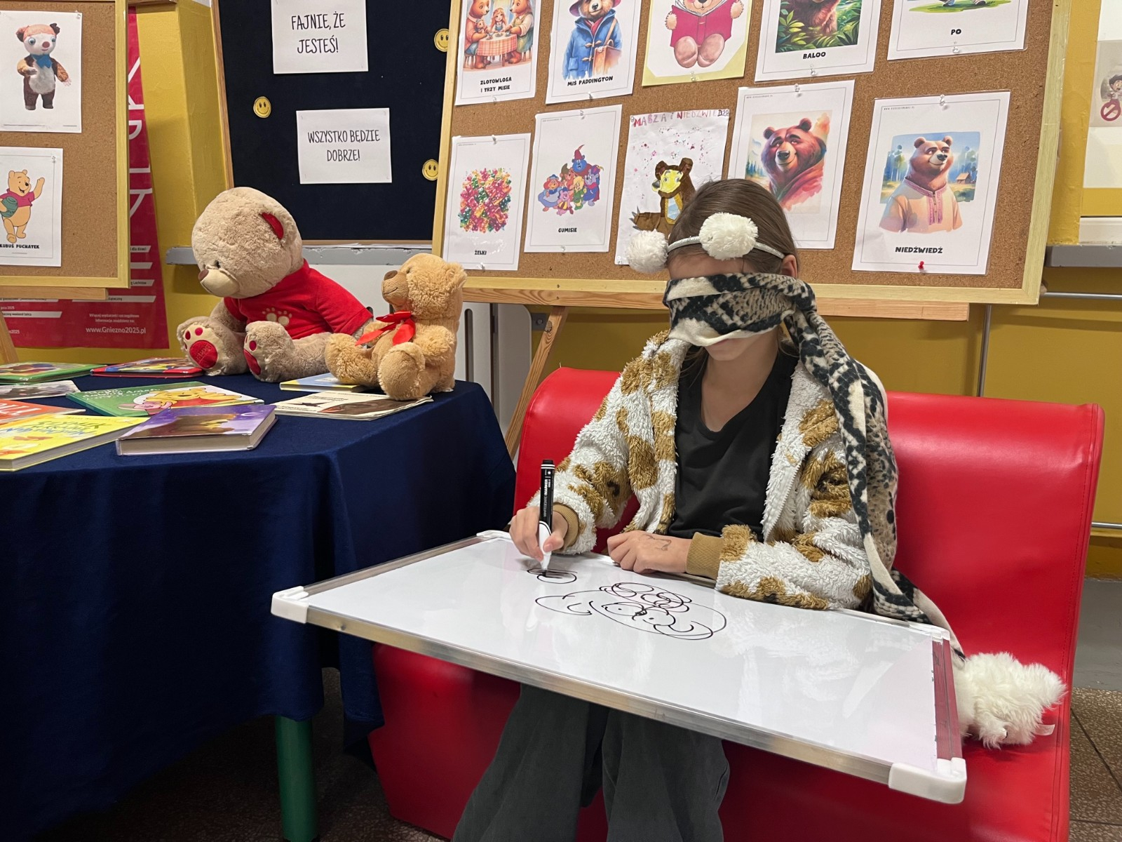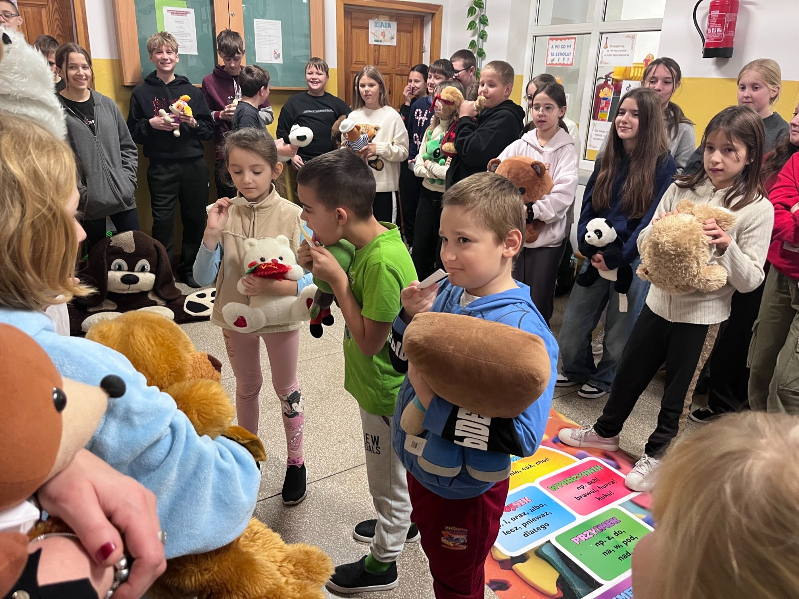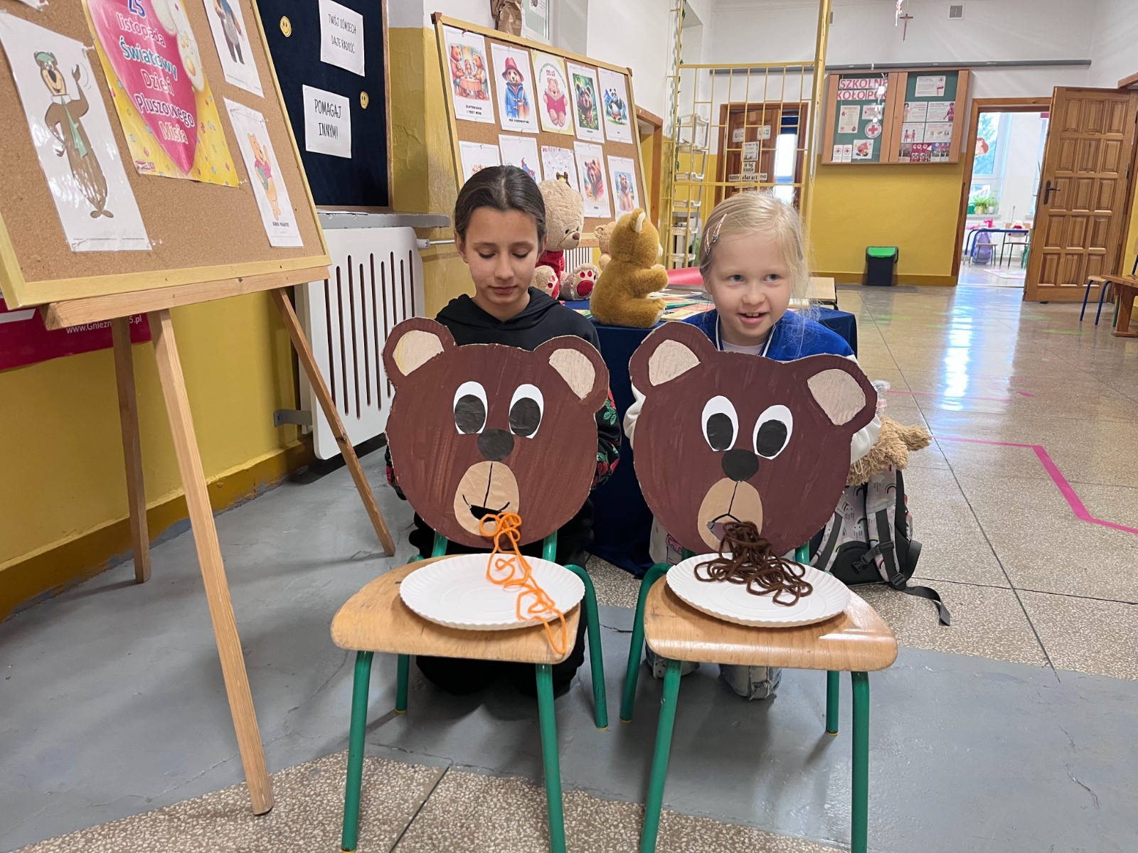 Już od samego rana korytarze wypełniły się uczniami, którzy przynieśli swoje ukochane pluszaki. Misie małe i duże, klasyczne, kolorowe, a nawet takie z historią – wszystkie tego dnia stały się szczególnymi bohaterami. Pierwszą atrakcją była emocjonująca konkurencja jedzenia miodu na czas. Okazało się, że uczniowie znakomicie wcielili się w rolę niedźwiadków – miód znikał z talerzyków w błyskawicznym tempie, a zabawie towarzyszyły salwy śmiechu i gromkie brawa. Następnie uczestnicy sprawdzali swoją wyobraźnię i poczucie humoru, biorąc udział w zadaniu rysowania misia z zasłoniętymi oczami. Powstałe prace były jedyne w swoim rodzaju – niektóre misie miały wyjątkowo duże łapki, inne odrobinę przesunięte uszy, ale wszystkie były niezwykle urocze. Dużo emocji wzbudziła także zabawa, w której kartonowy miś „zjadał” włóczkowy makaron. Uczniowie sprawdzali swoją celność i zręczność, starając się nakarmić misia kolorowymi sznurkami. Ta nietypowa konkurencja szybko stała się jedną z ulubionych. Na zakończenie pełnego wrażeń dnia wszyscy zasiedli wygodnie, by wysłuchać opowiadań o misiach. Wspólne czytanie przeniosło dzieci do świata przygód, ciepła i przyjaźni, przypominając, dlaczego pluszowy miś od ponad wieku jest najlepszym towarzyszem najmłodszych. Światowy Dzień Pluszowego Misia w naszej szkole był pełen radości, uśmiechu i twórczej zabawy. To święto po raz kolejny udowodniło, że choć misie są pluszowe, ich znaczenie i magia są jak najbardziej prawdziwe.